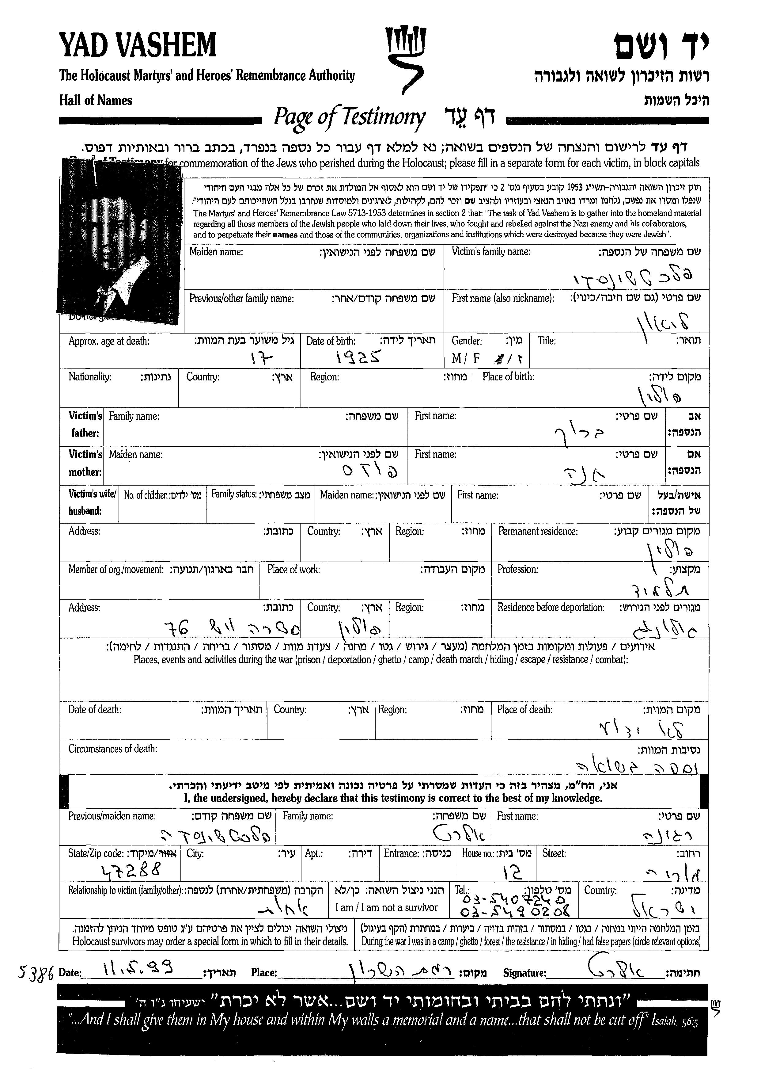 Яд Вашем - Листы свидетельских показаний Мемориального фонда