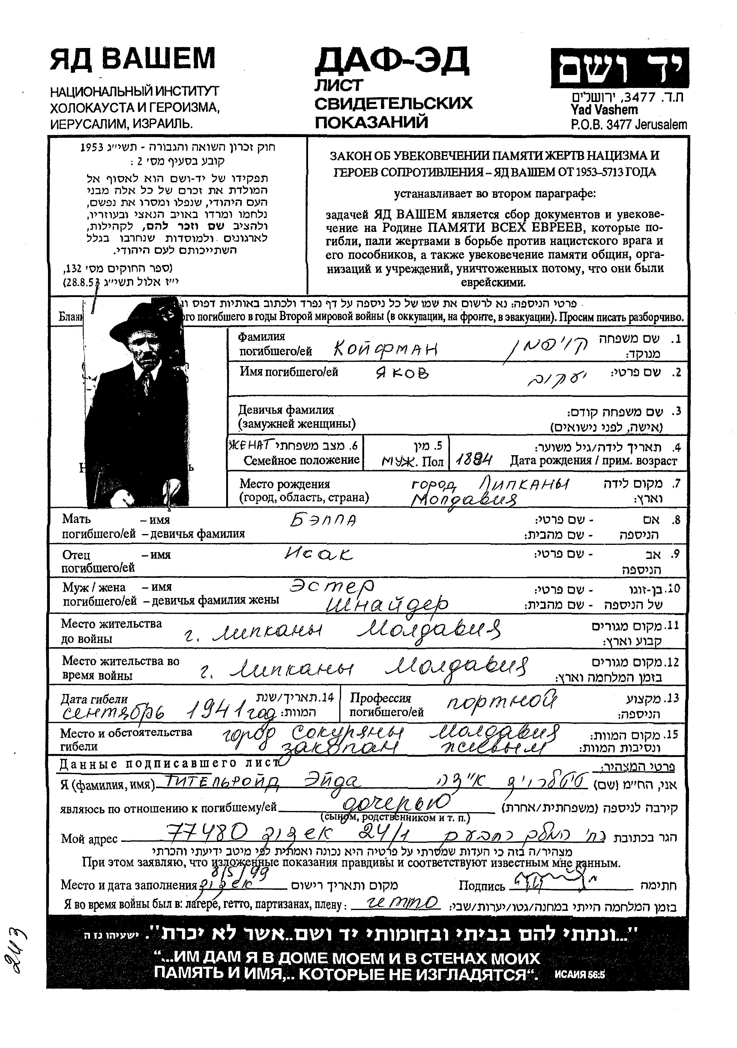 Койфман Яков 1884 Липкань, Румыния Лист свидетельских показаний