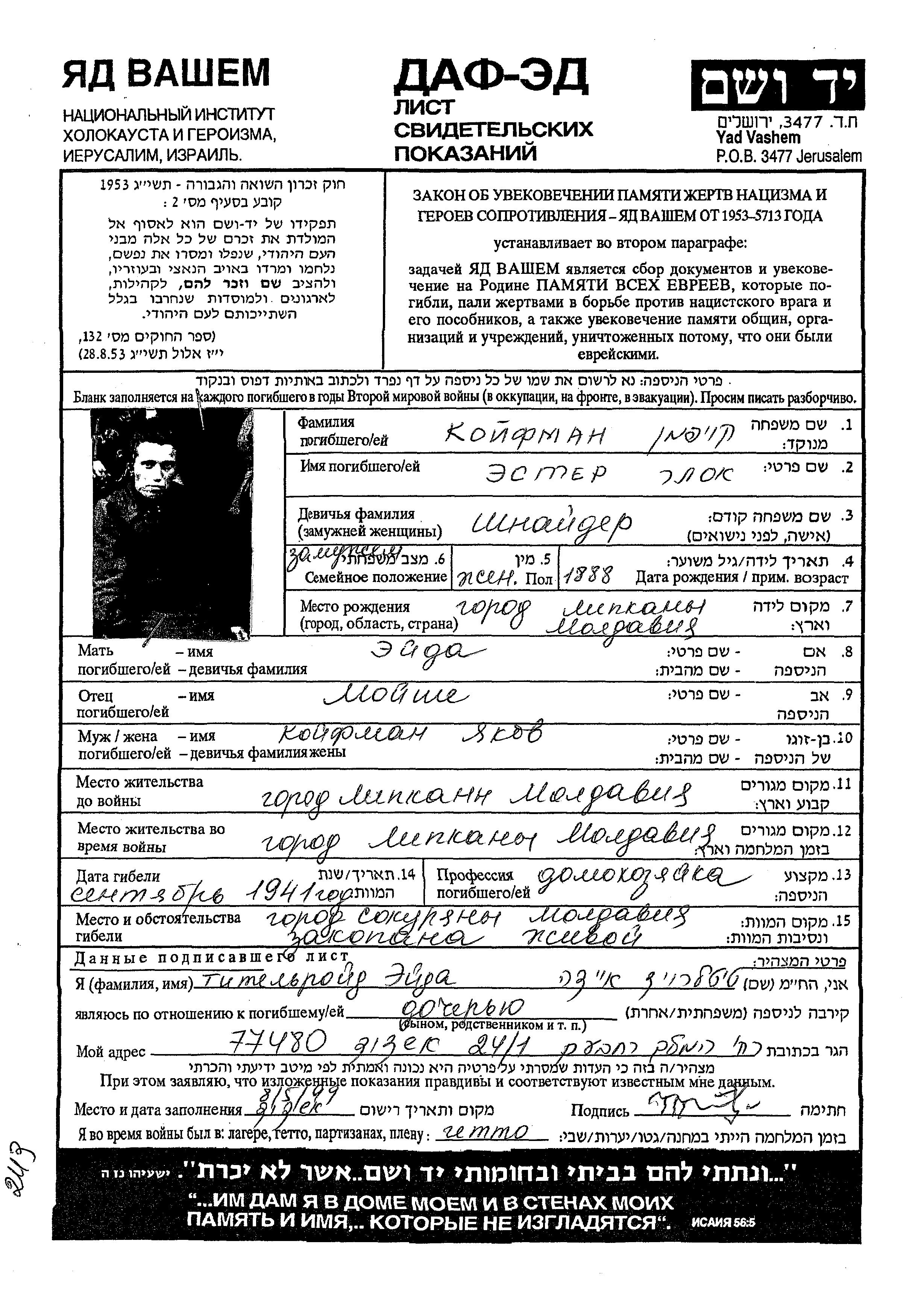 Койфман | Эстер | 1888 | Липкань, Румыния | Лист свидетельских показаний |
