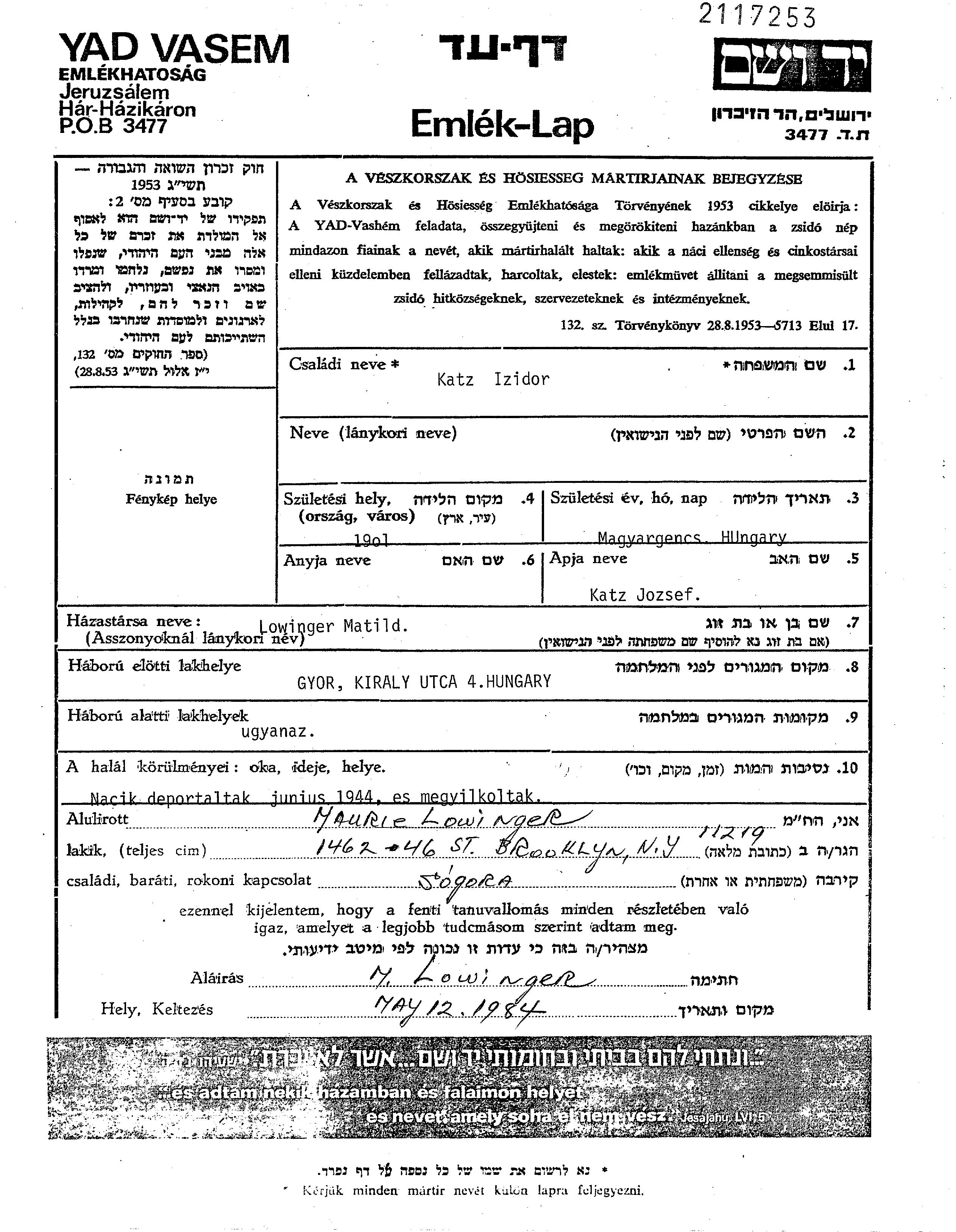 Изидор Кац, место рождения: Генч, Чехословакия. Отец: Йозеф. Женат / замужем. Место жительства до войны: Дьёр, Венгрия. Место во время войны: Дьёр, Венгрия.