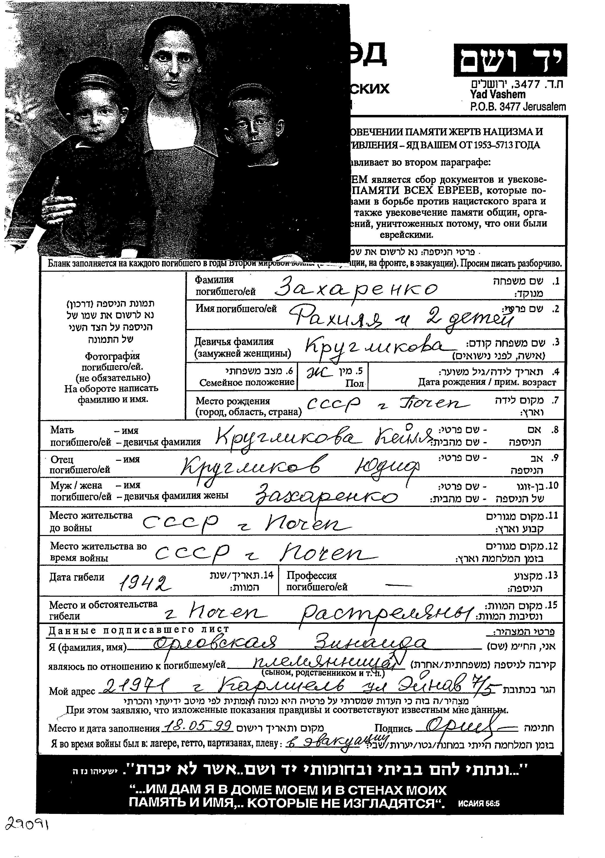 Захаренко Рахиля Почеп, Россия (СССР) Лист свидетельских показаний