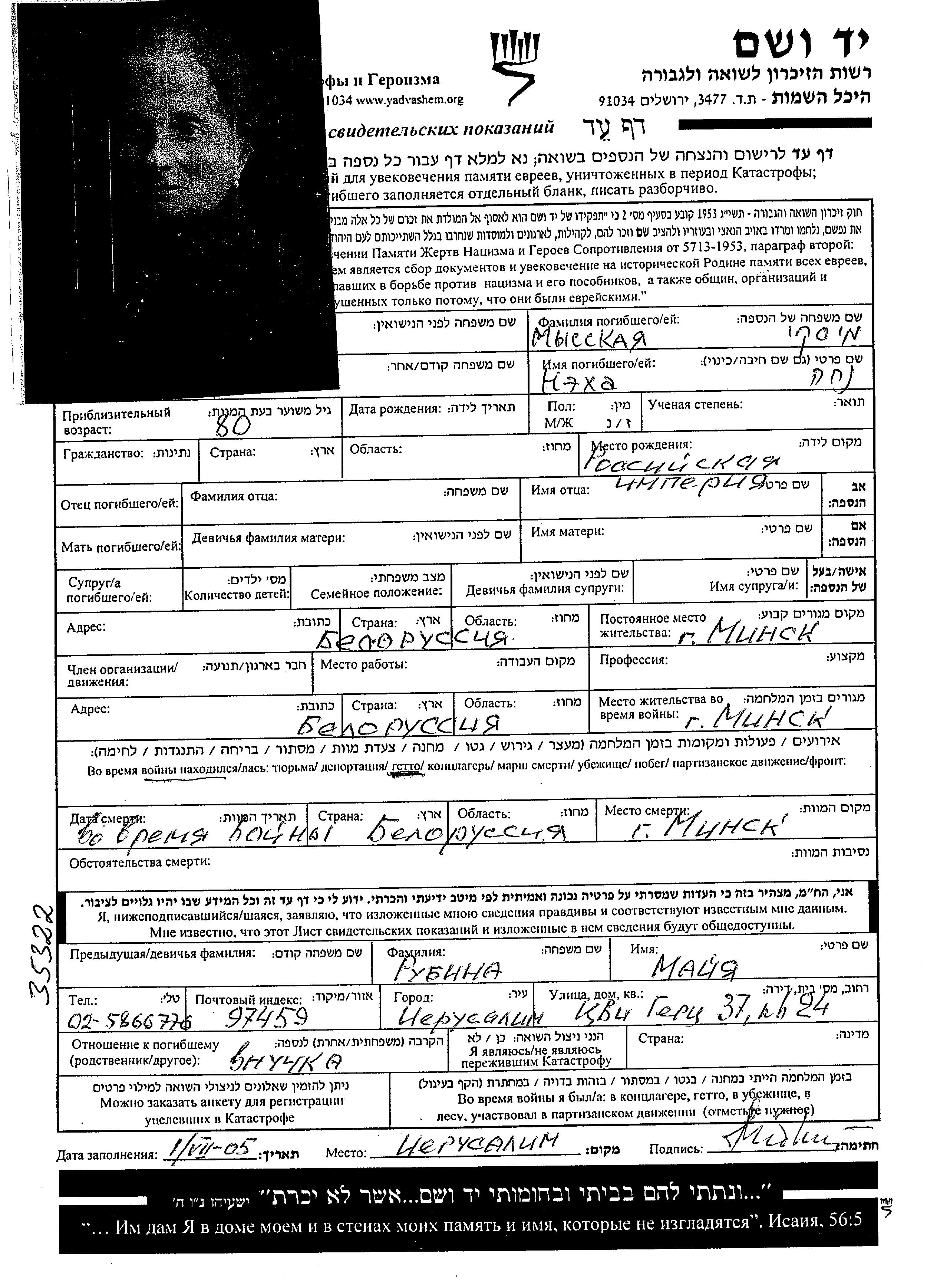 Мысская | Неха | Минск, Белоруссия (СССР) | Лист свидетельских показаний | |