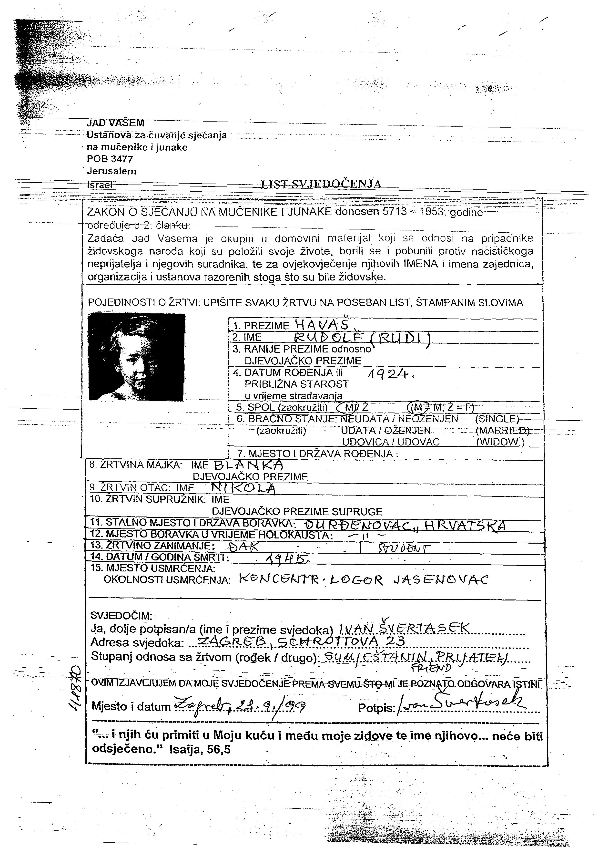 Хавас Руди 1924 Дурденовац, Югославия Лист свидетельских показаний