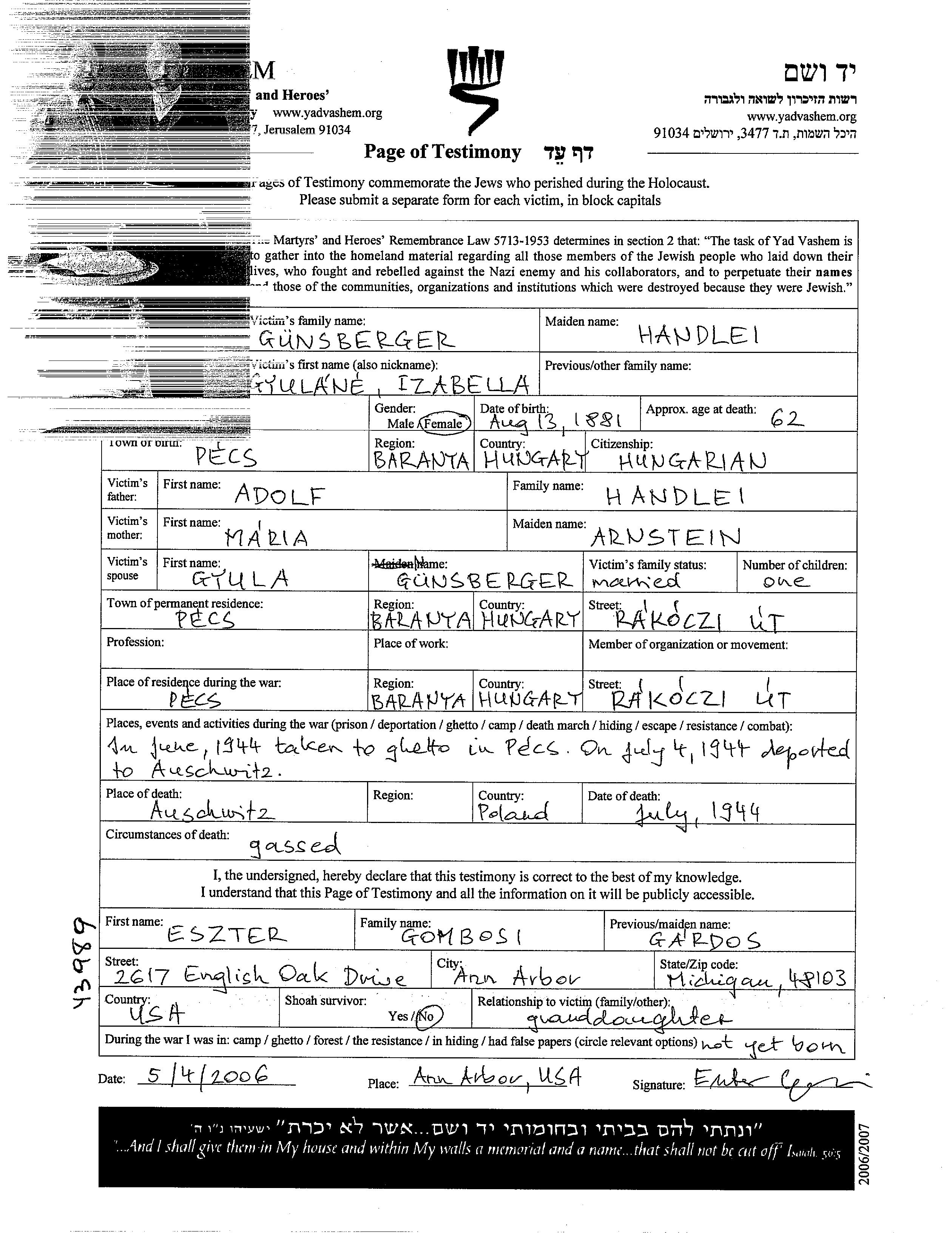 Гюнсбергер | Изабелла | 1881 | Печ, Венгрия | Лист свидетельских показаний |