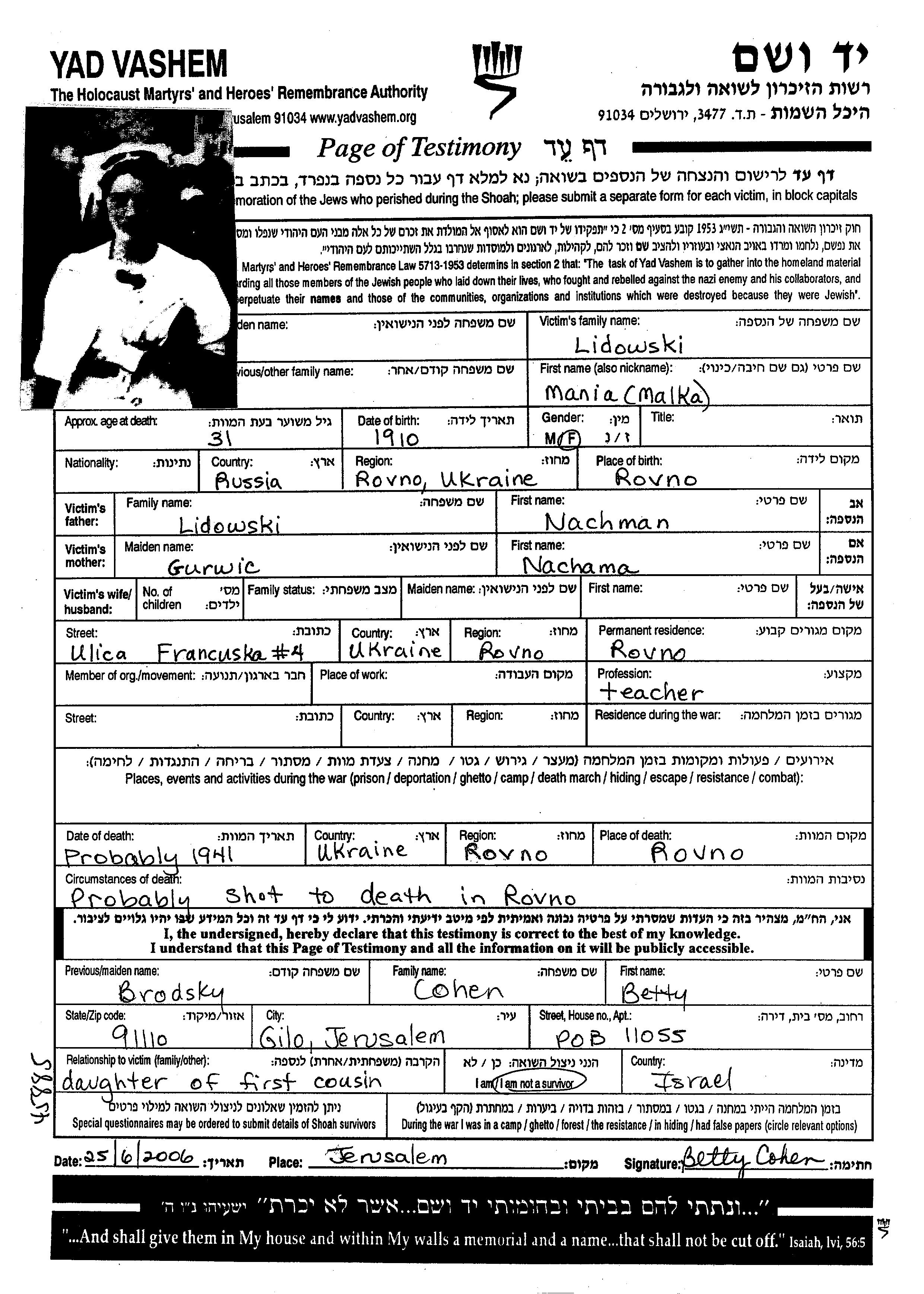 Маня Малка Лидовски, место рождения: Ровно, Польша. Учитель / учительница. Место жительства до войны: Ровно, Польша.