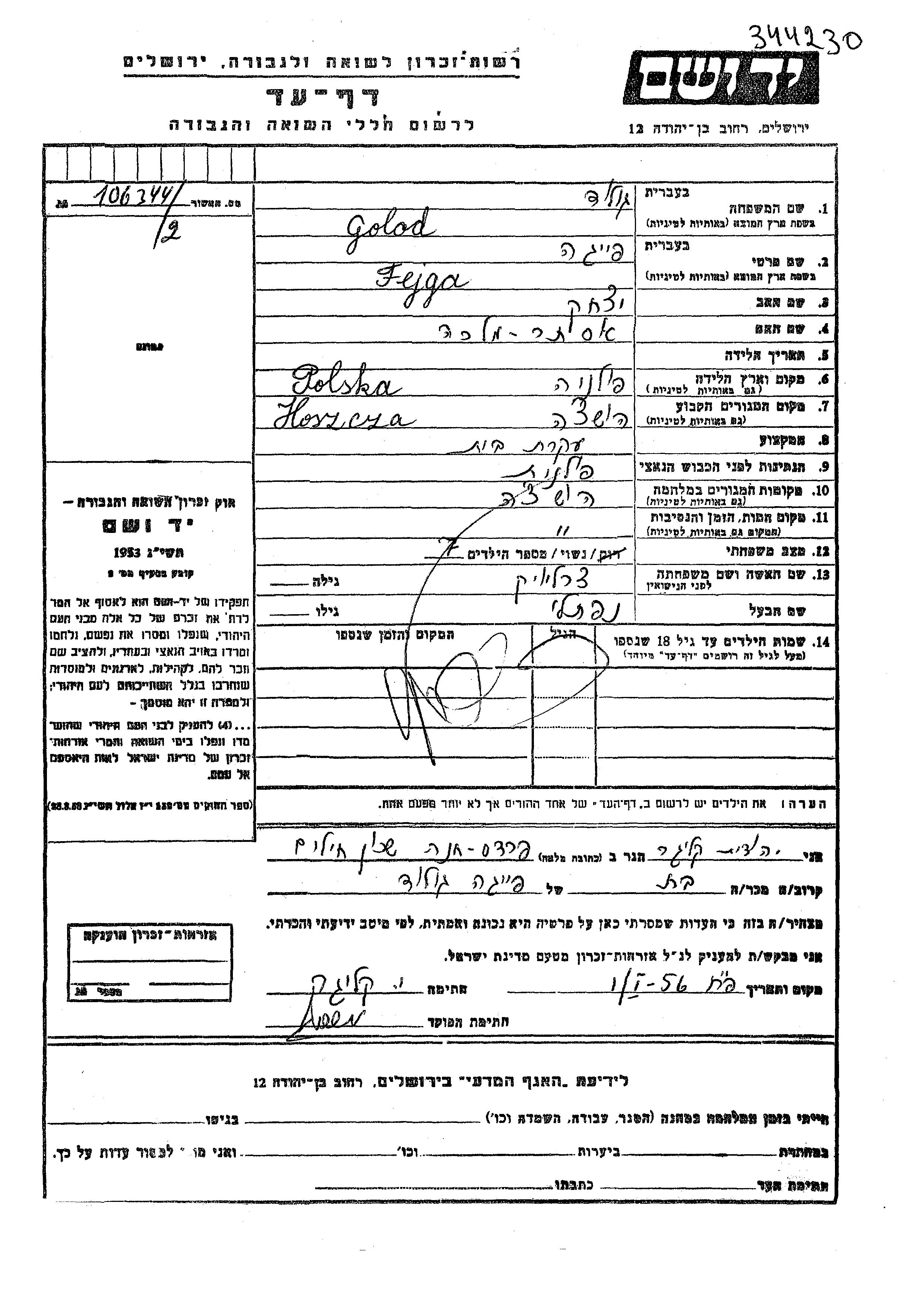 Фейга Голод, девичья фамилия Цирлук, место рождения: Польша. Домохозяйка. Место жительства до войны: Гоща, Польша.