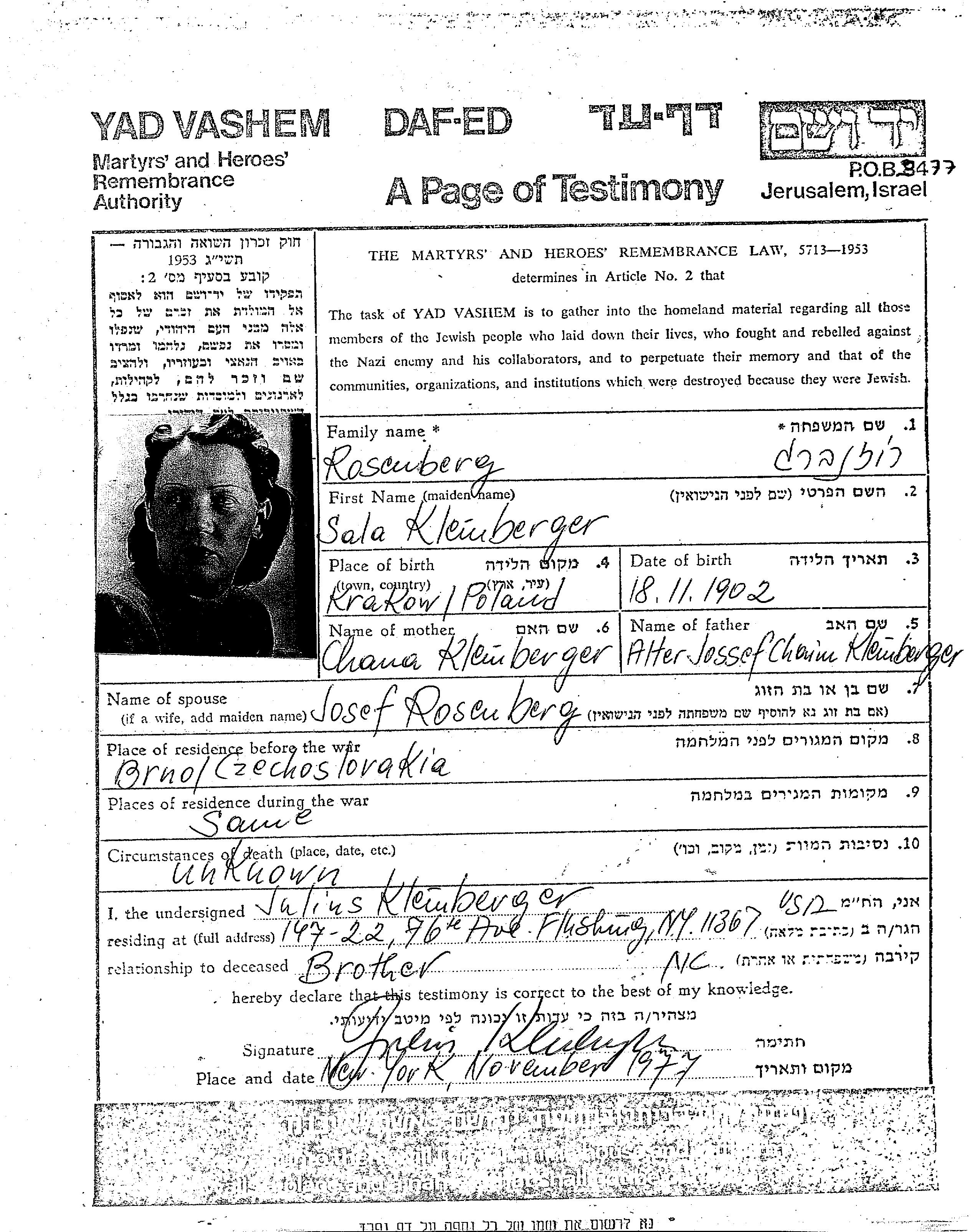 Сала Розенберг, девичья фамилия Клейнбергер, место рождения: Краков, Польша. Место жительства до войны: Брно, Чехословакия.