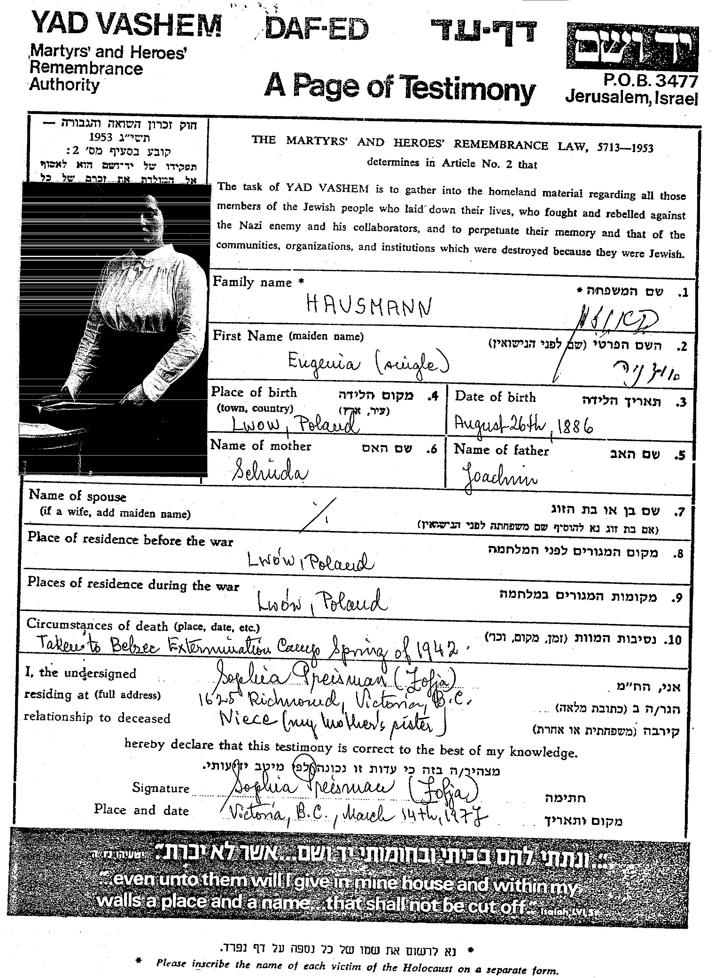 Хойзман Эугения 1886 Львов, Польша Лист свидетельских показаний