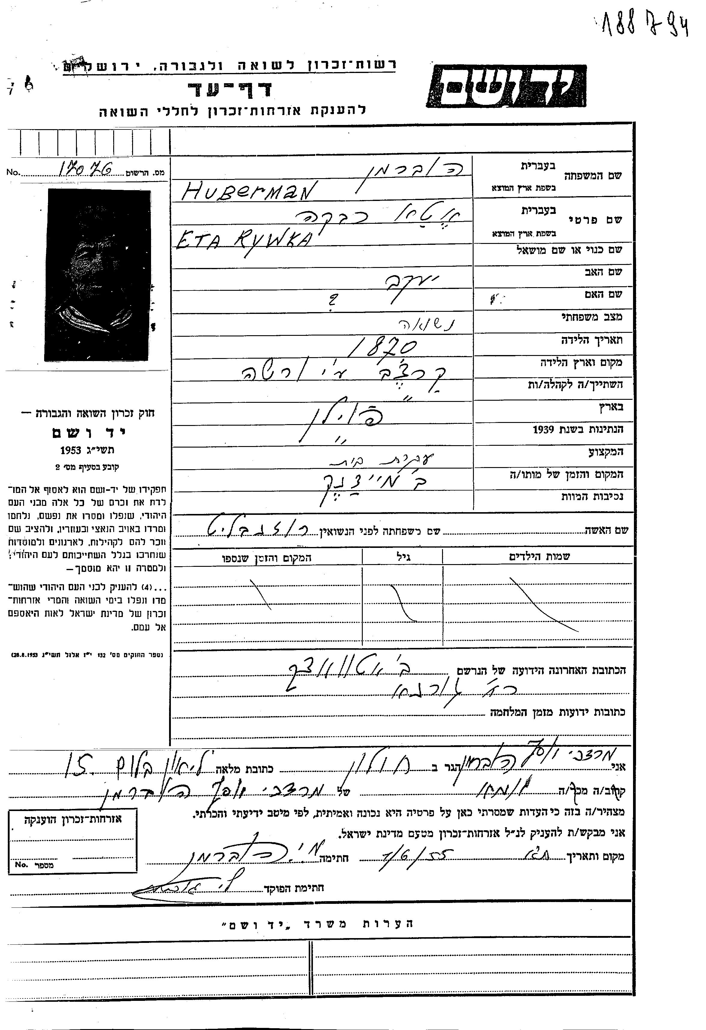 Эта Рывка Ата Хуберман, девичья фамилия Розенблит, место рождения: Карчев, Польша. Домохозяйка. Место жительства до войны: Карчев, Польша.