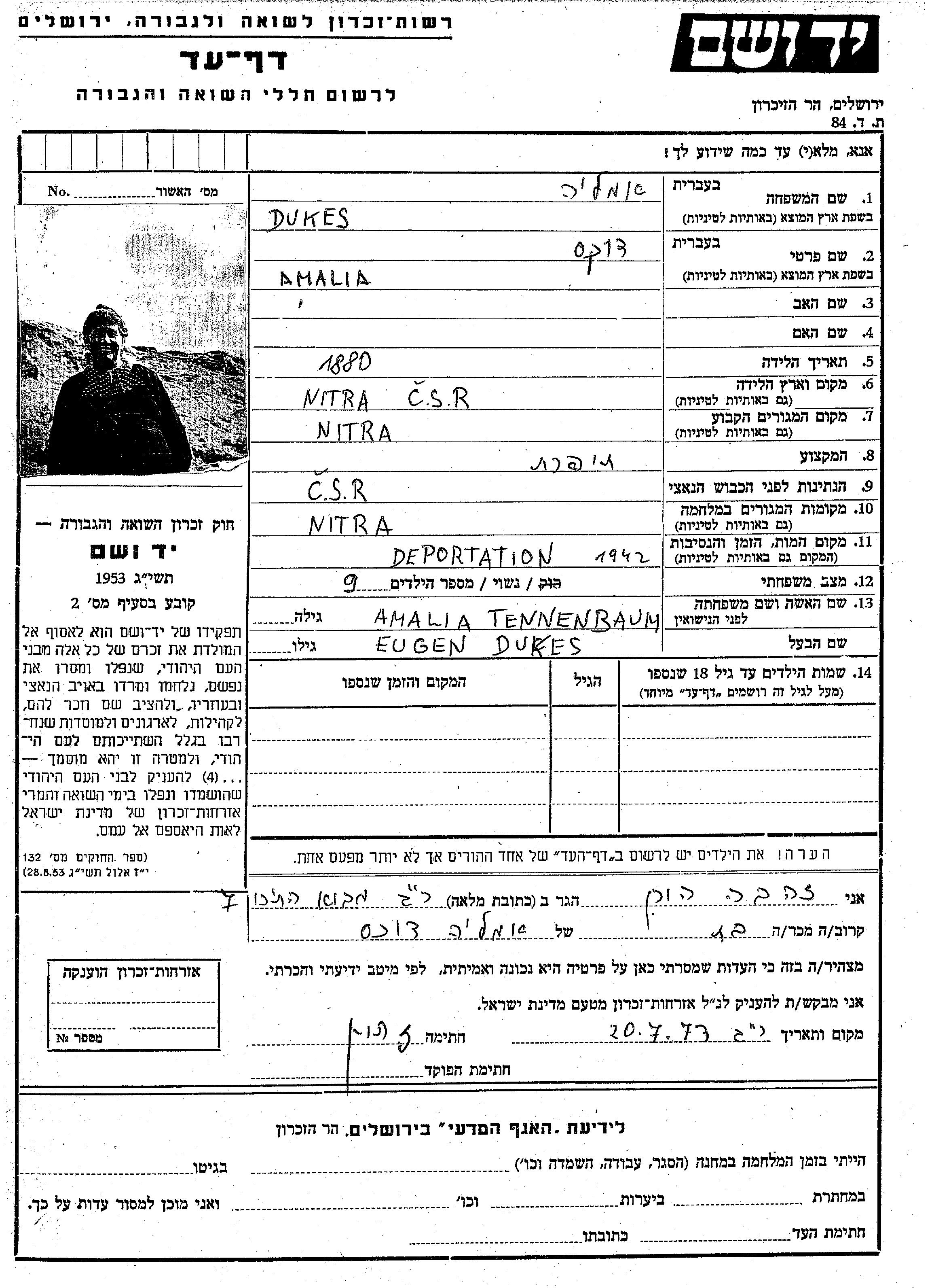 Амалия Дукес, девичья фамилия Тенненбаум, место рождения: Нитра, Чехословакия. Швея. Место жительства до войны: Нитра, Чехословакия.