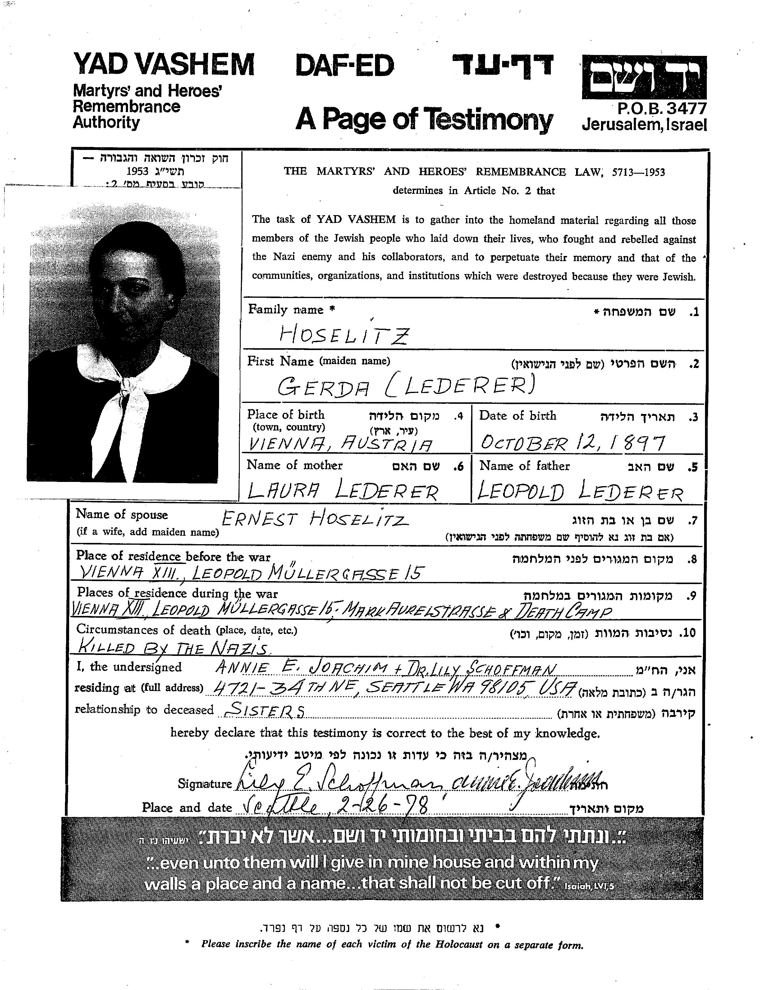 Герда Хозелиц, девичья фамилия Ледерер, место рождения: Вена, Австрия. Место жительства до войны: Вена, Австрия.