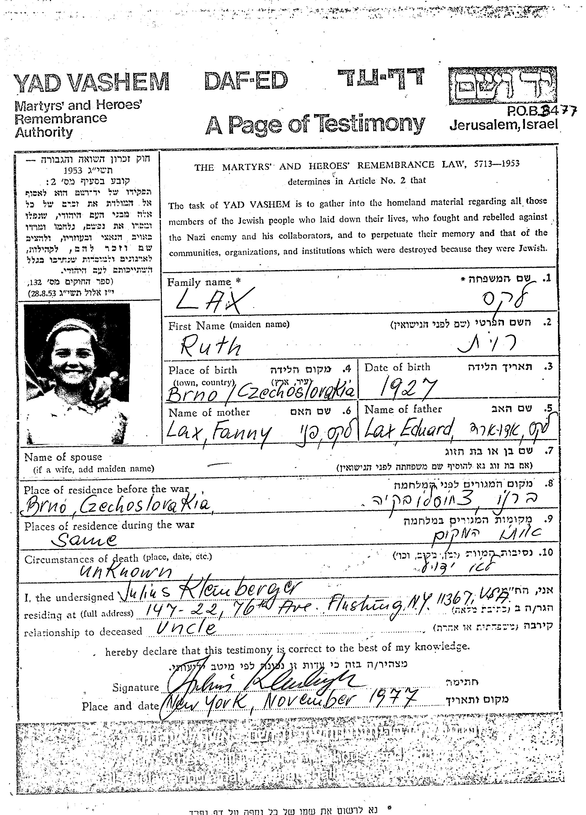 Рут Лакс, место рождения: Брно, Чехословакия. Место жительства до войны: Брно, Чехословакия.