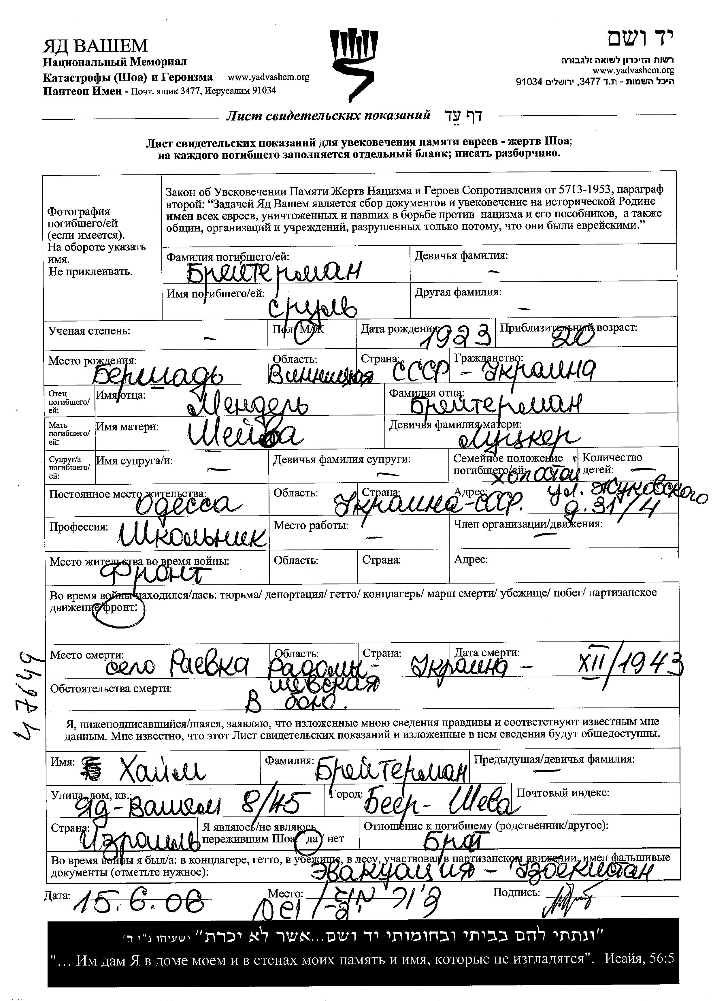 Брейтерман Сруль 1923 Одесса, Украина (СССР) Лист свидетельских показаний