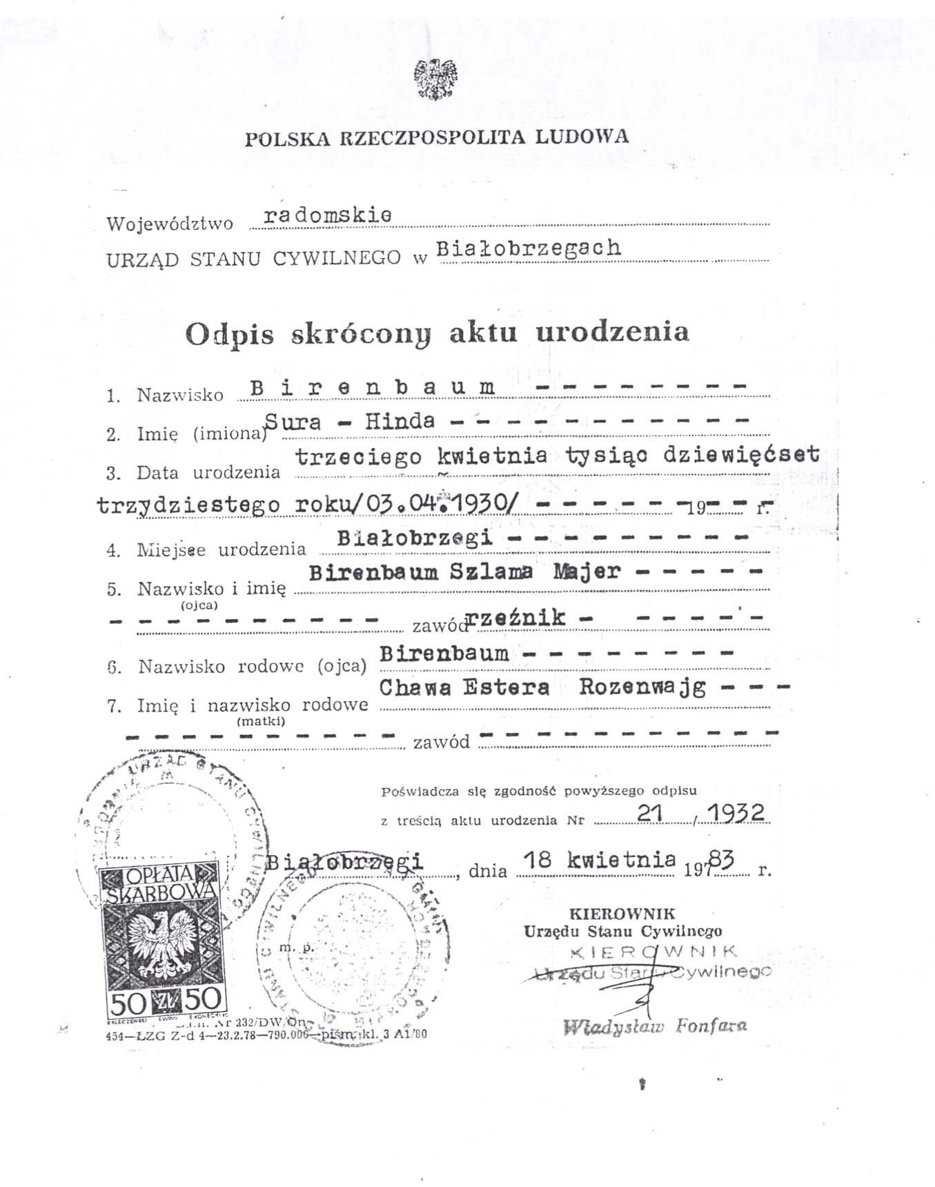 Биренбаум Сура Хинда 1930 Бялобжеги, Польша Лист свидетельских показаний