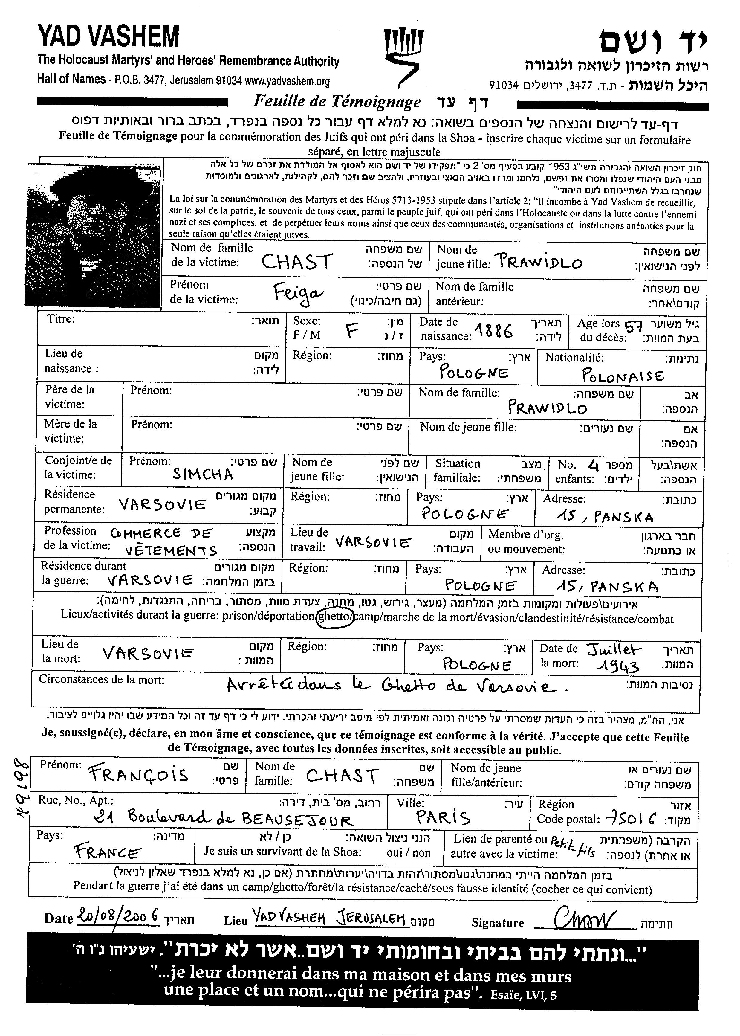 Фейга Chast, девичья фамилия Правидло, место рождения: Польша. Торговец одеждой. Место жительства до войны: Варшава, Польша.