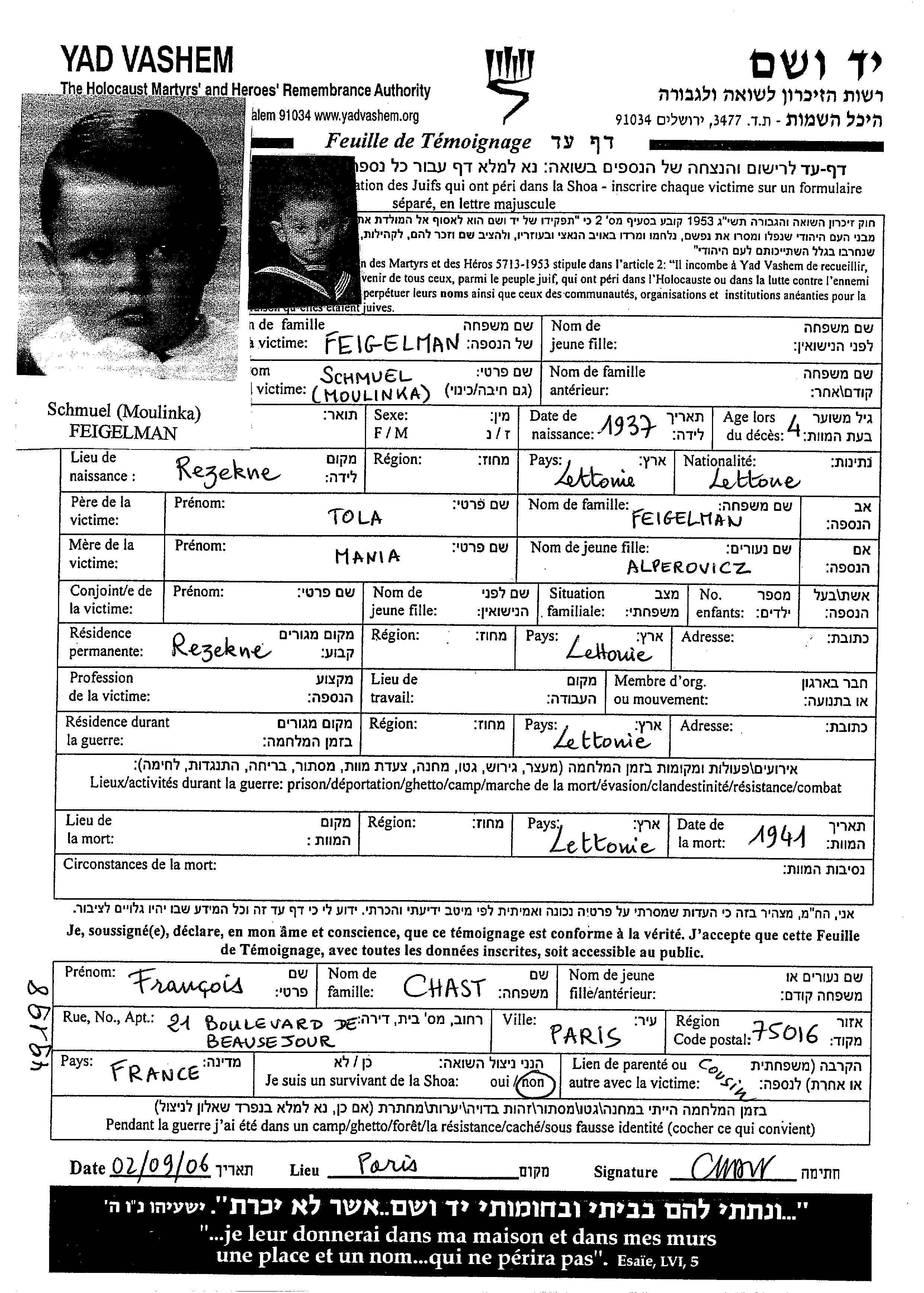 | Фейгельман | Мулинька | 1937 | Резекне, Латвия | Лист свидетельских показаний |