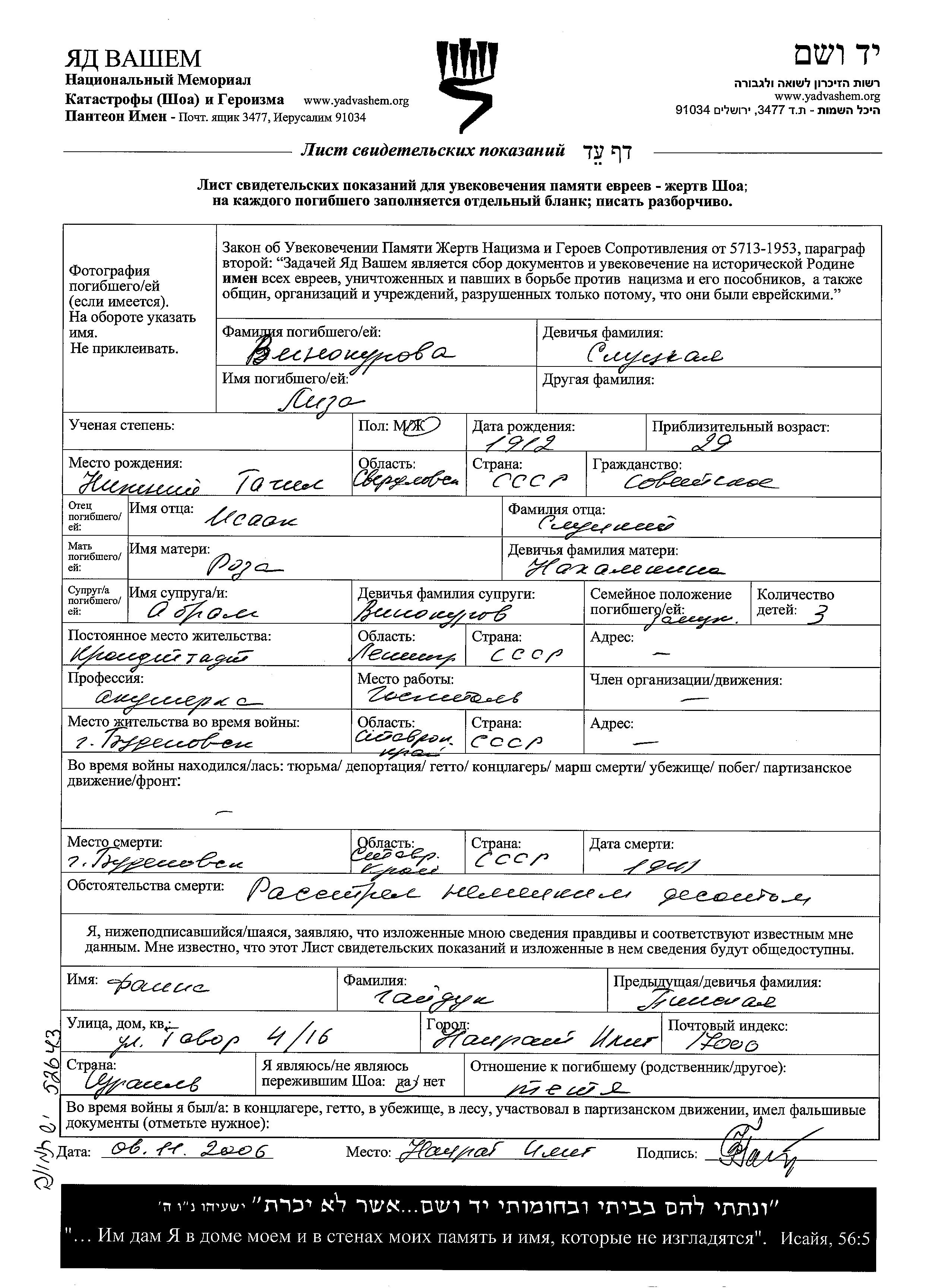 Винокурова | Лиза | 1912 | Кронштадт, Россия (СССР) | Лист свидетельских показаний |