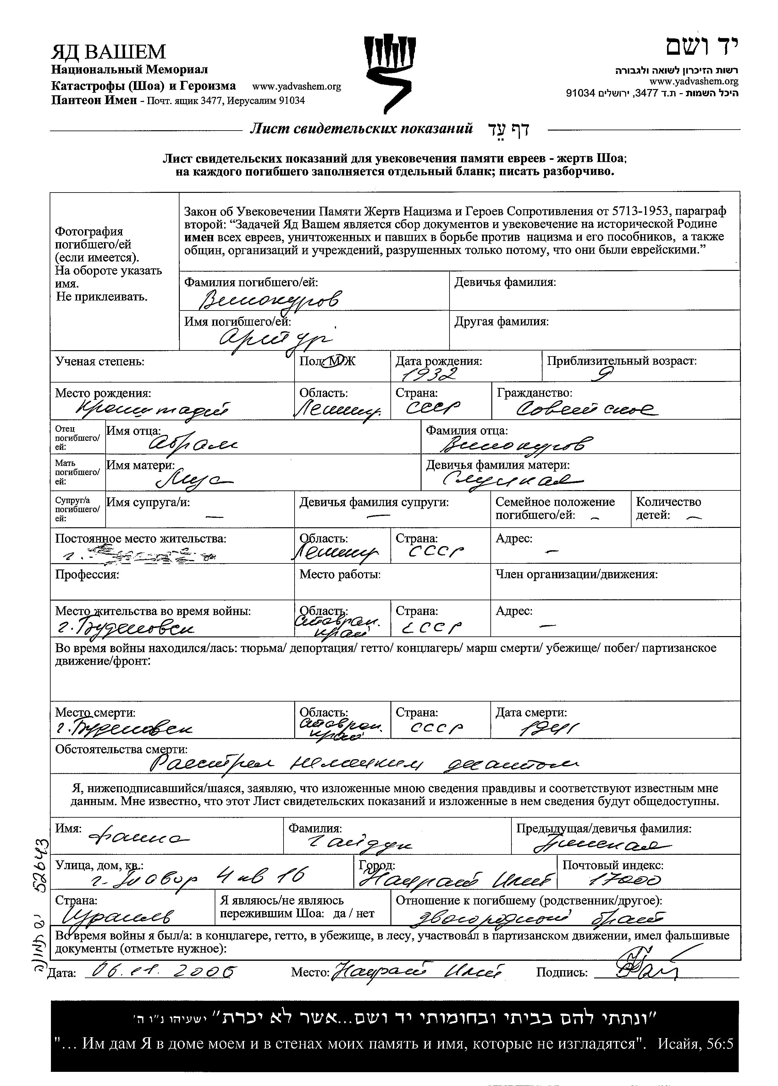 Винокуров Артур 1932 Кронштадт, Россия (СССР) Лист свидетельских показаний
