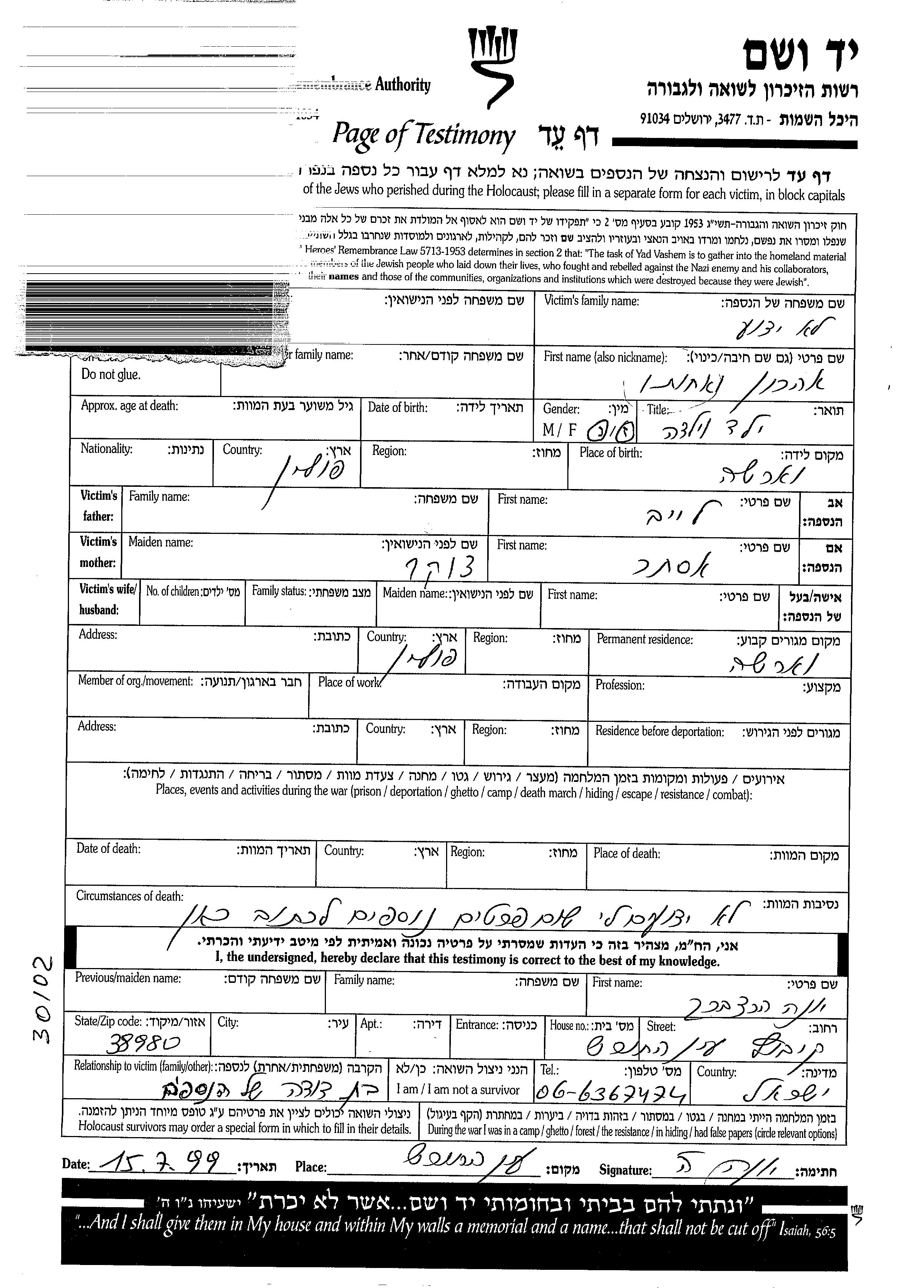 Фамилия неизвестна | Аарон | Варшава, Польша | Лист свидетельских показаний | |