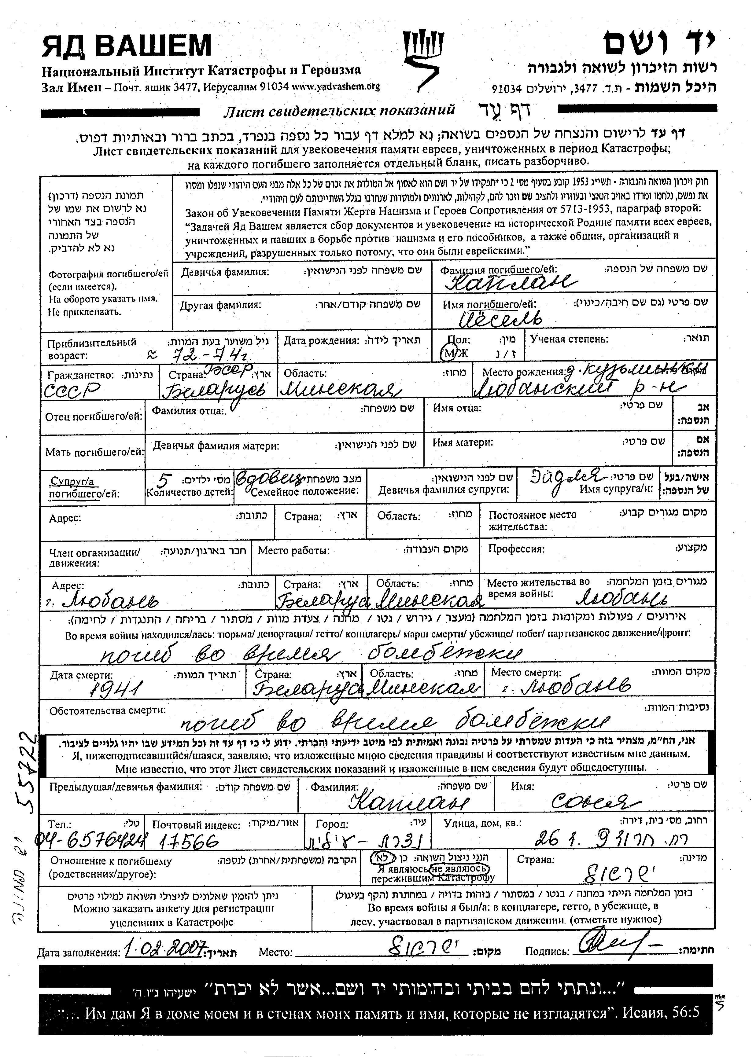 Каплан Йосел Любань, Белоруссия (СССР) Лист свидетельских показаний
