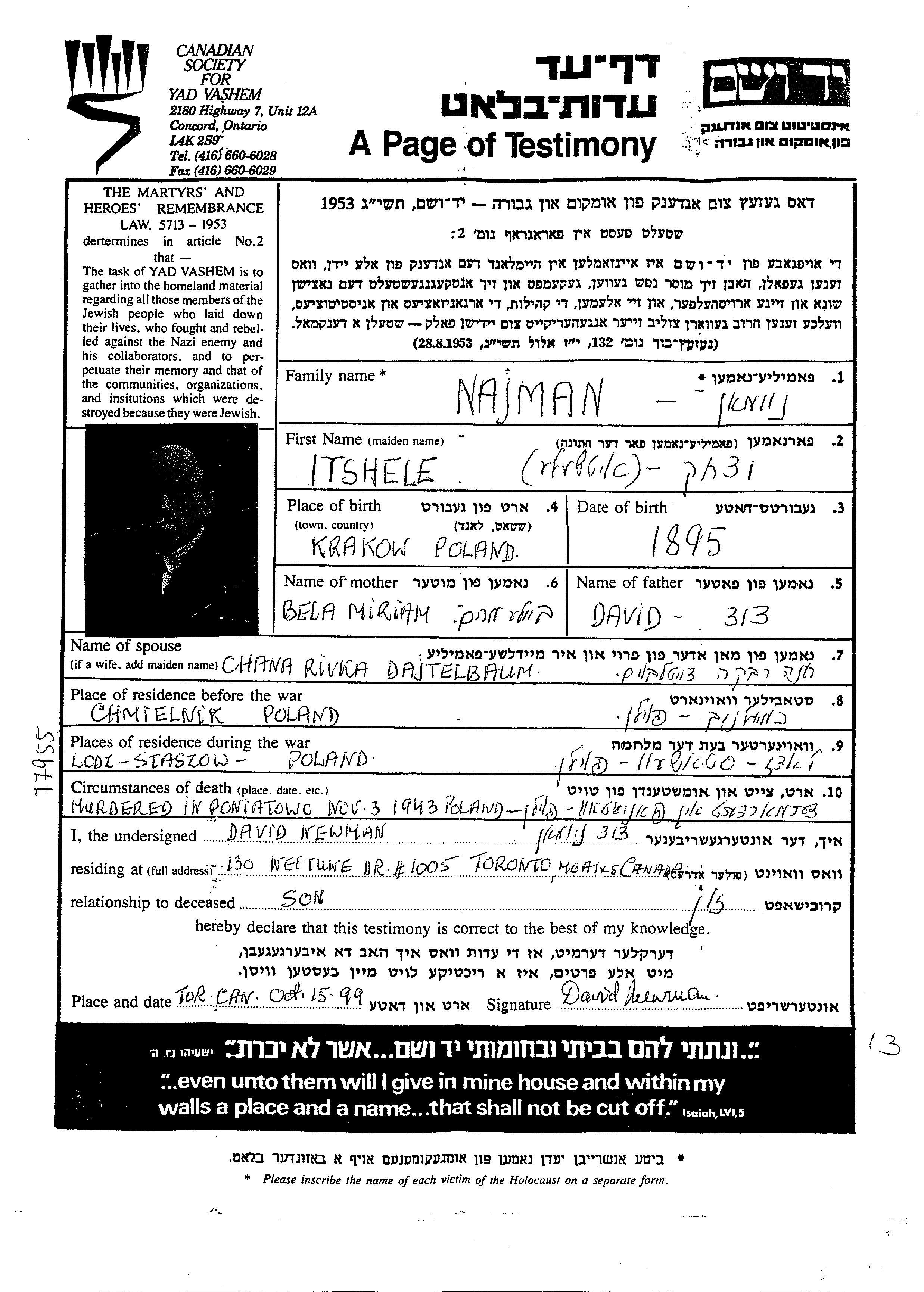 Найман Ичеле 1895 Хмельник, Польша Лист свидетельских показаний