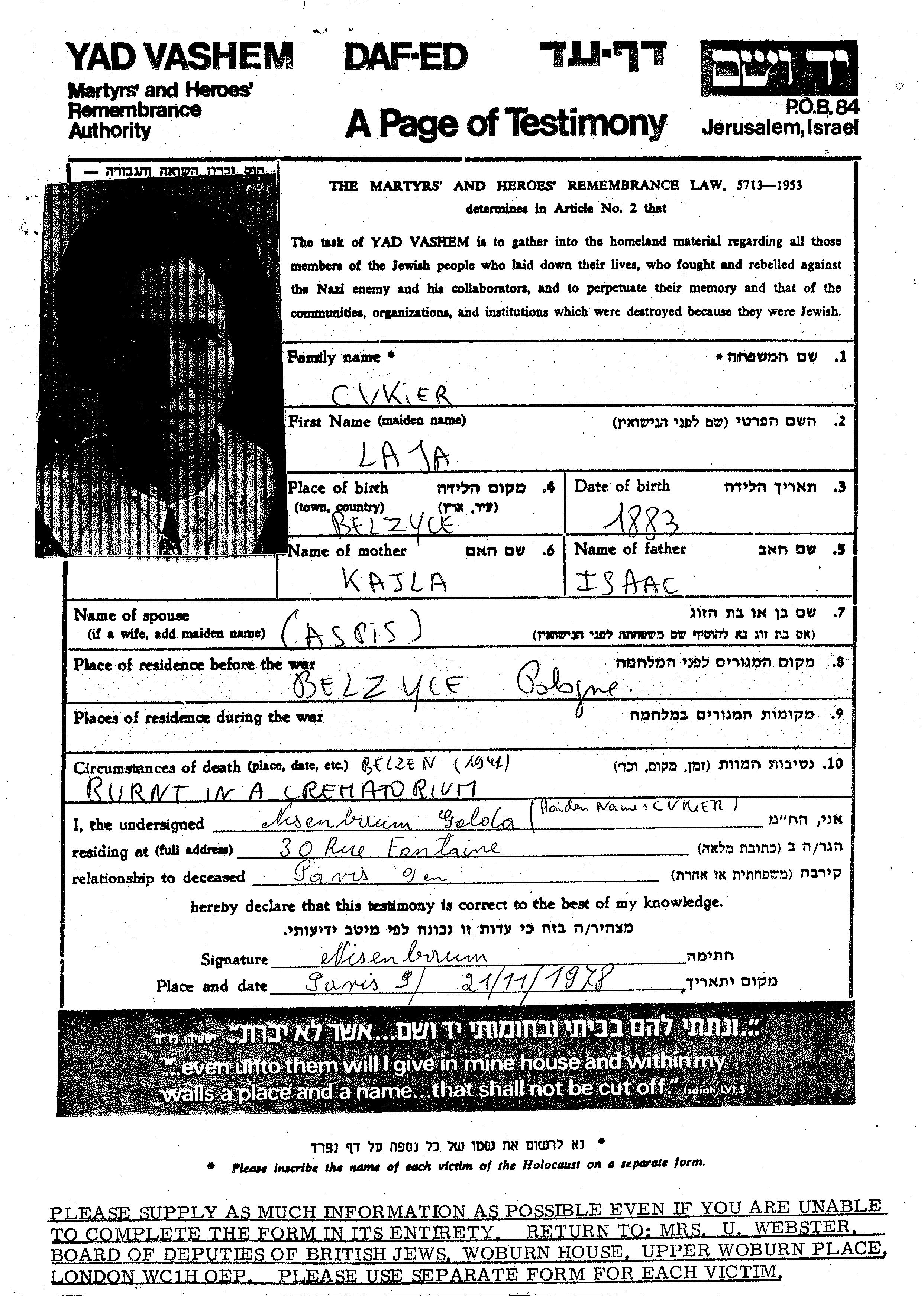 Цукер Лая 1883 Белжице, Польша Лист свидетельских показаний