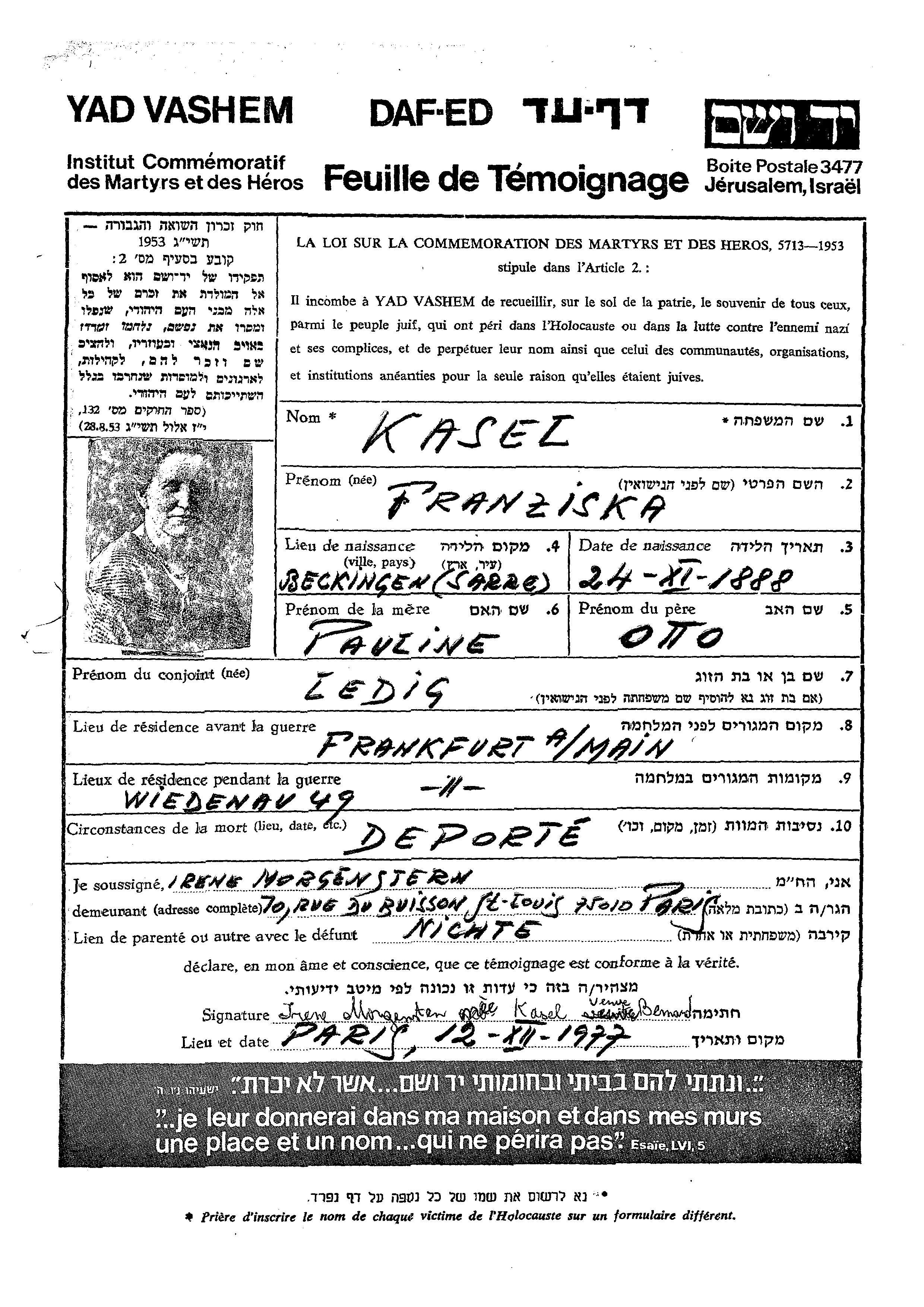 Франциска Касель, место рождения: Беккинген, Германия. Место жительства до войны: Франкфурт, Германия.