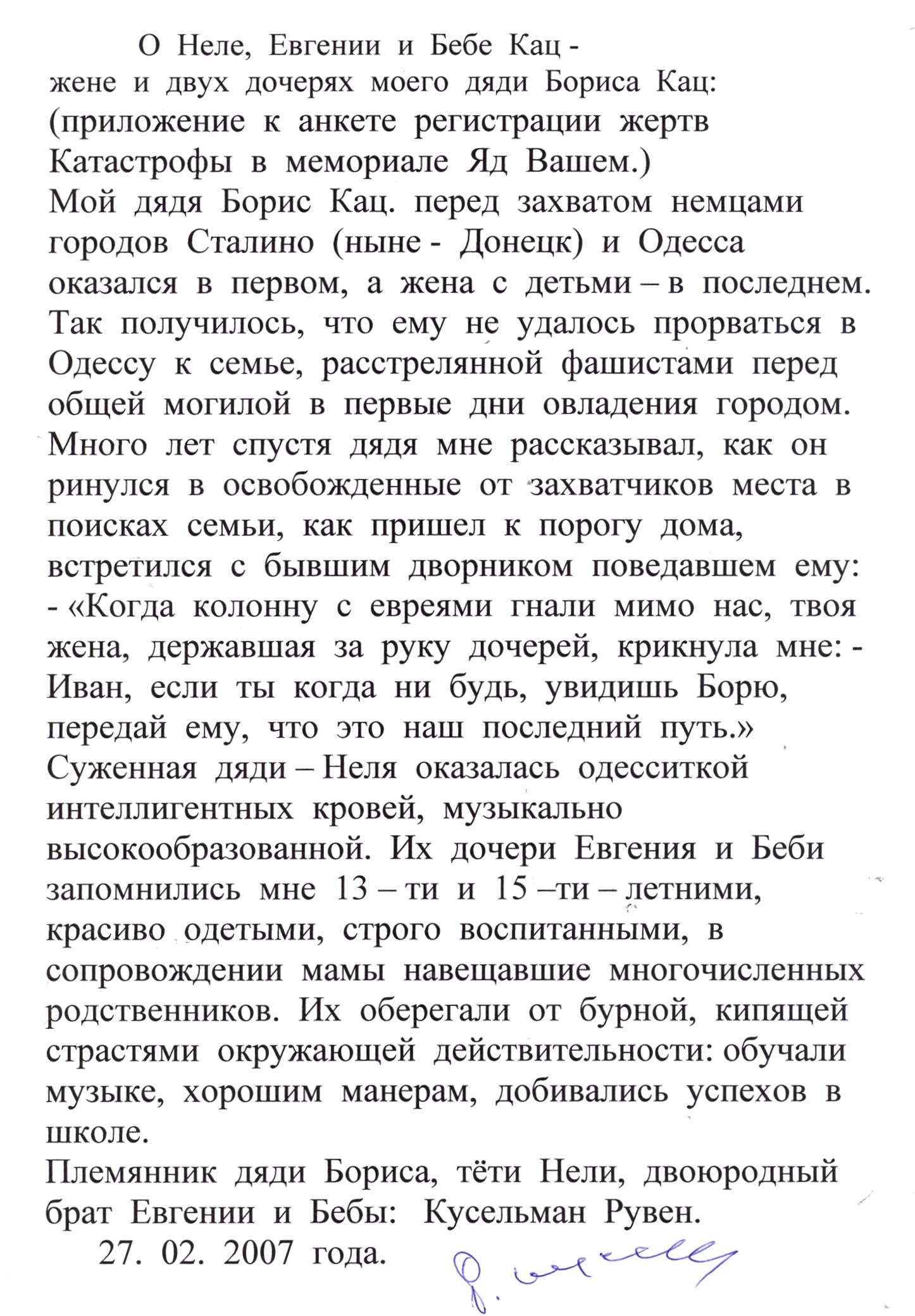Кац Неля 1901 Одесса, Украина (СССР) Лист свидетельских показаний