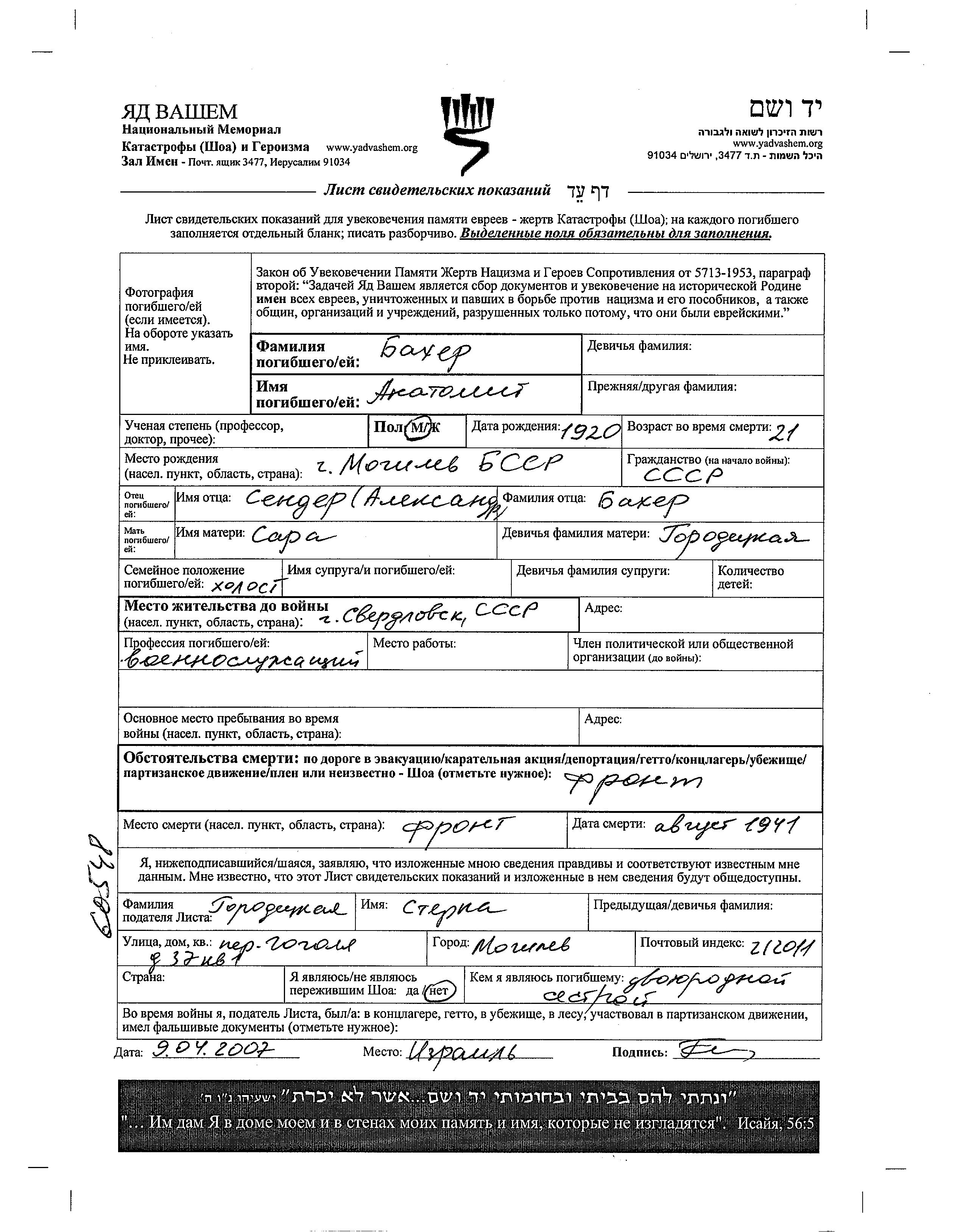 Бахер Анатолий 1920 Свердловск, Россия (СССР) Лист свидетельских показаний