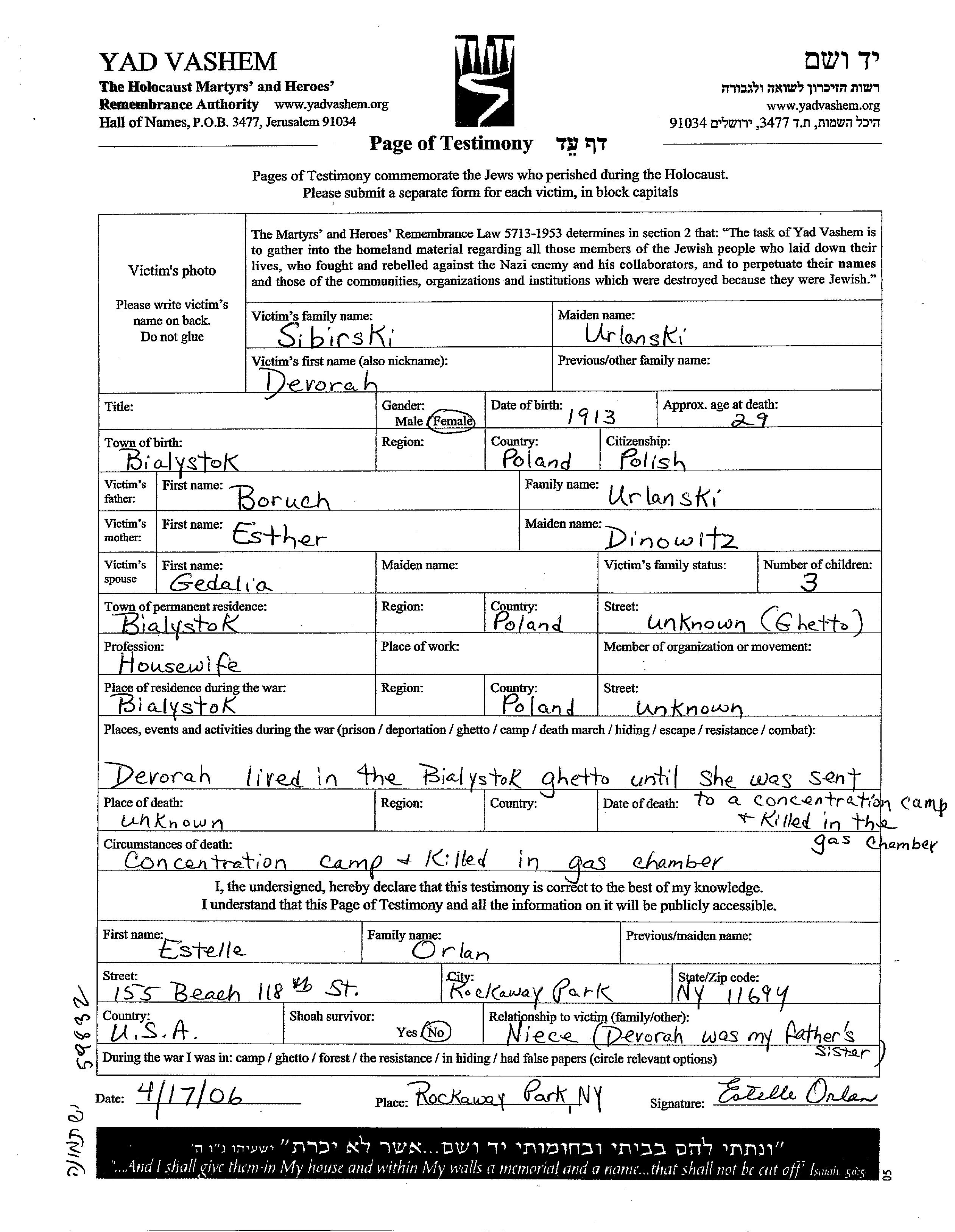 Сибирски | Девора | 1913 | Белосток, Польша | Лист свидетельских показаний |