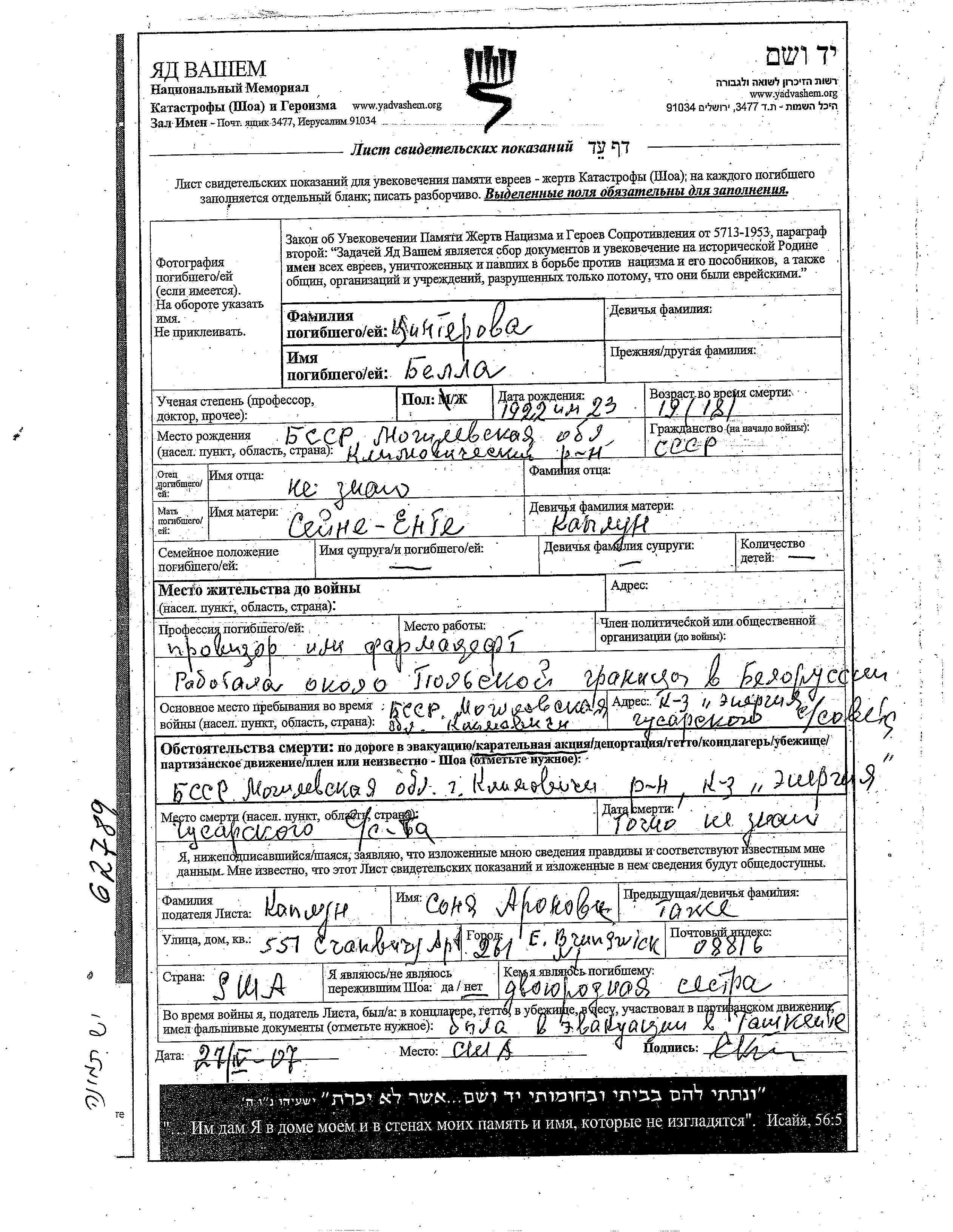 | Цингерова | Белла | 1922 | Климовичи, Белоруссия (СССР) | Лист свидетельских показаний |