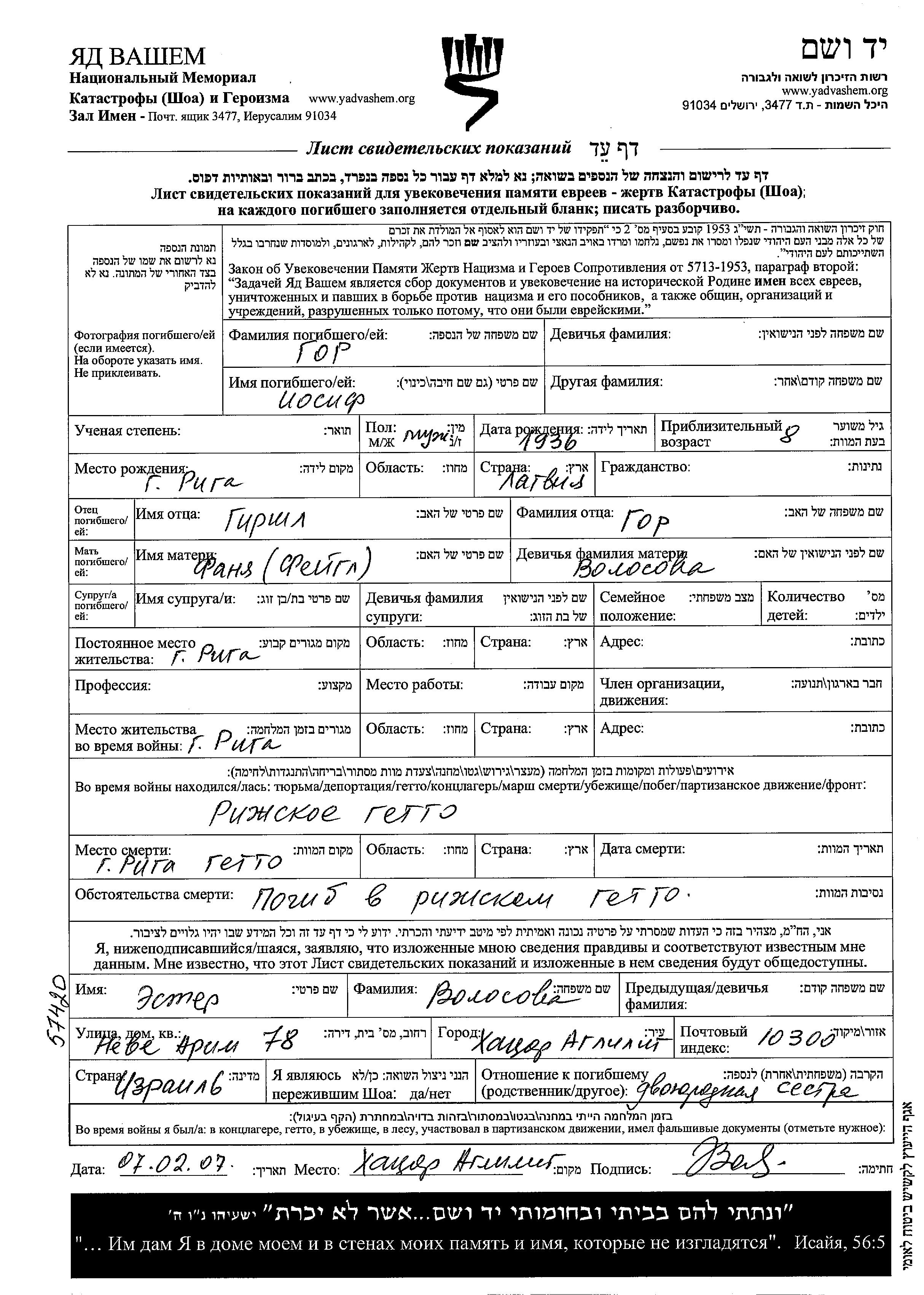 Гор Иосиф 1936 Рига, Латвия Лист свидетельских показаний