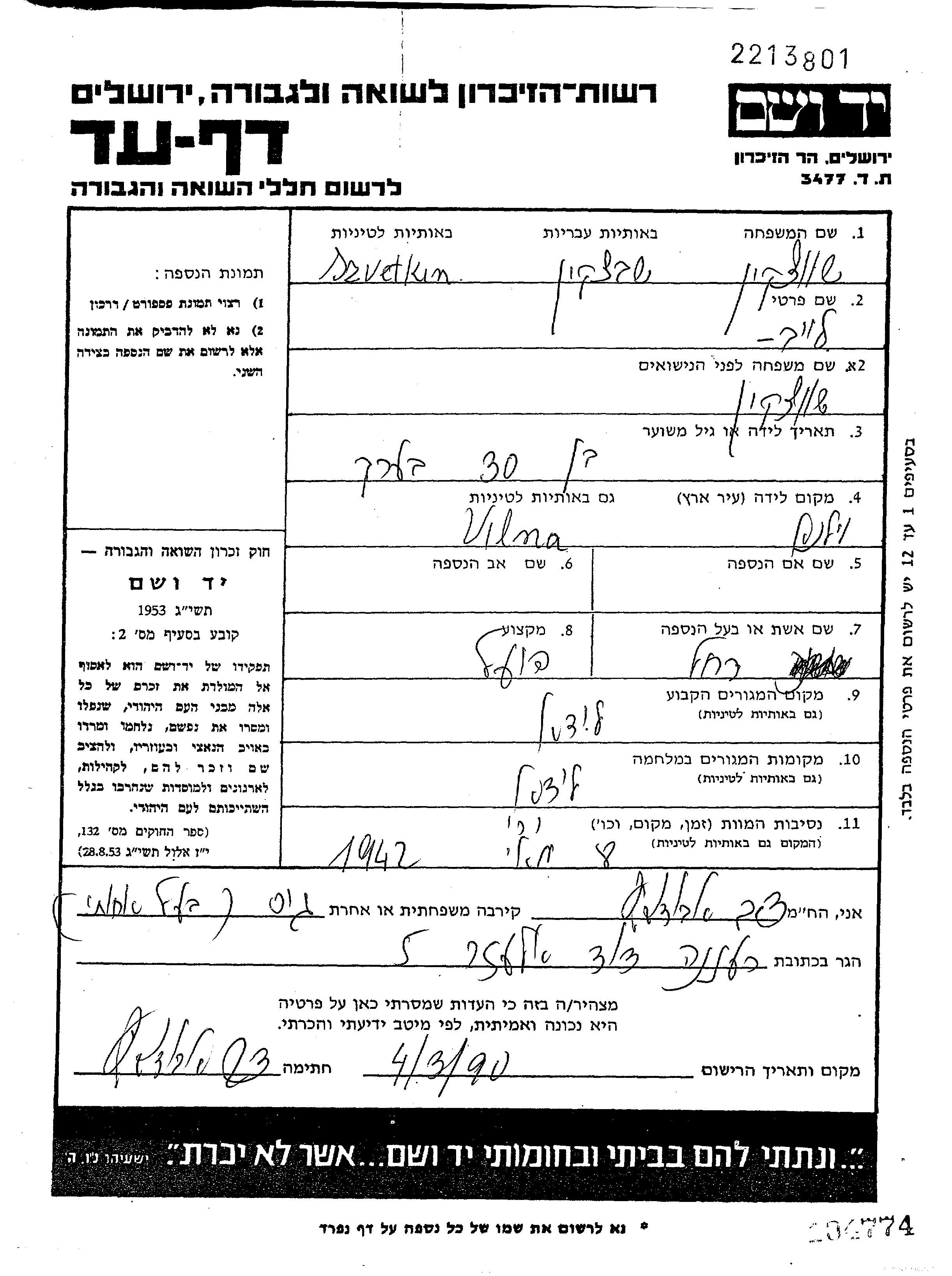 Яд Вашем - Листы свидетельских показаний Мемориального фонда