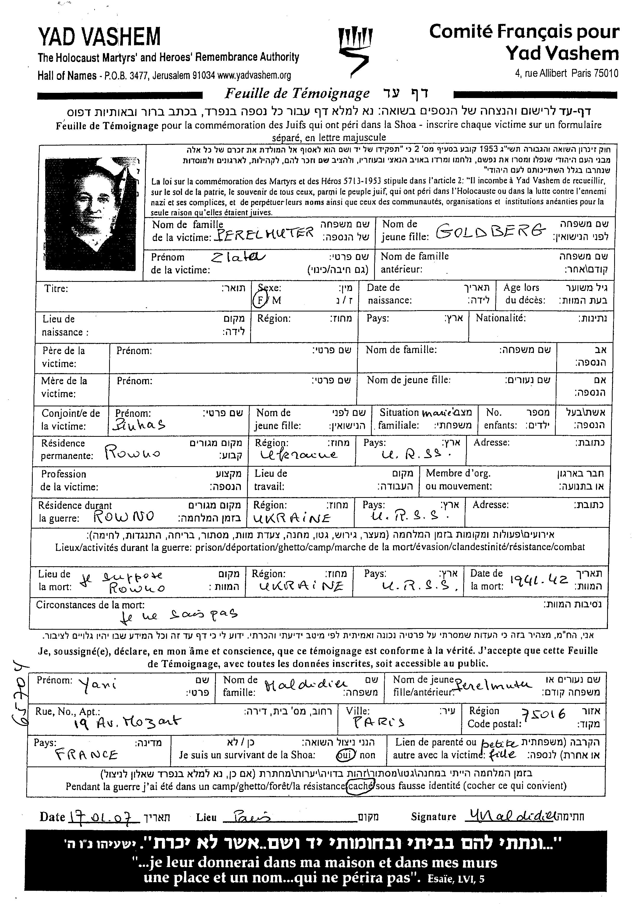 Злата Перельмутер, девичья фамилия Гольдберг. Место жительства до войны: Ровно, Польша.