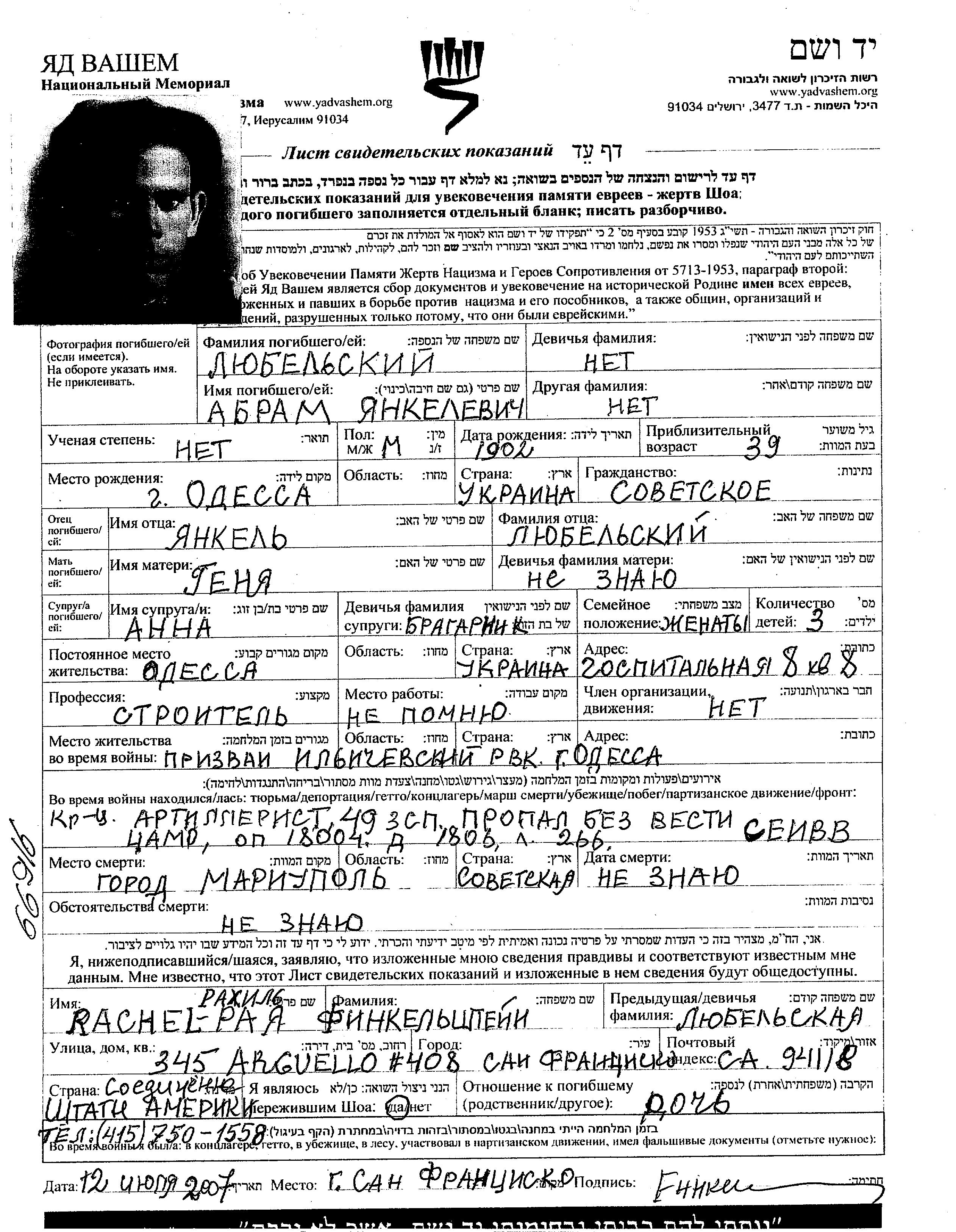 Любельски Абрам 1902 Одесса, Украина (СССР) Лист свидетельских показаний