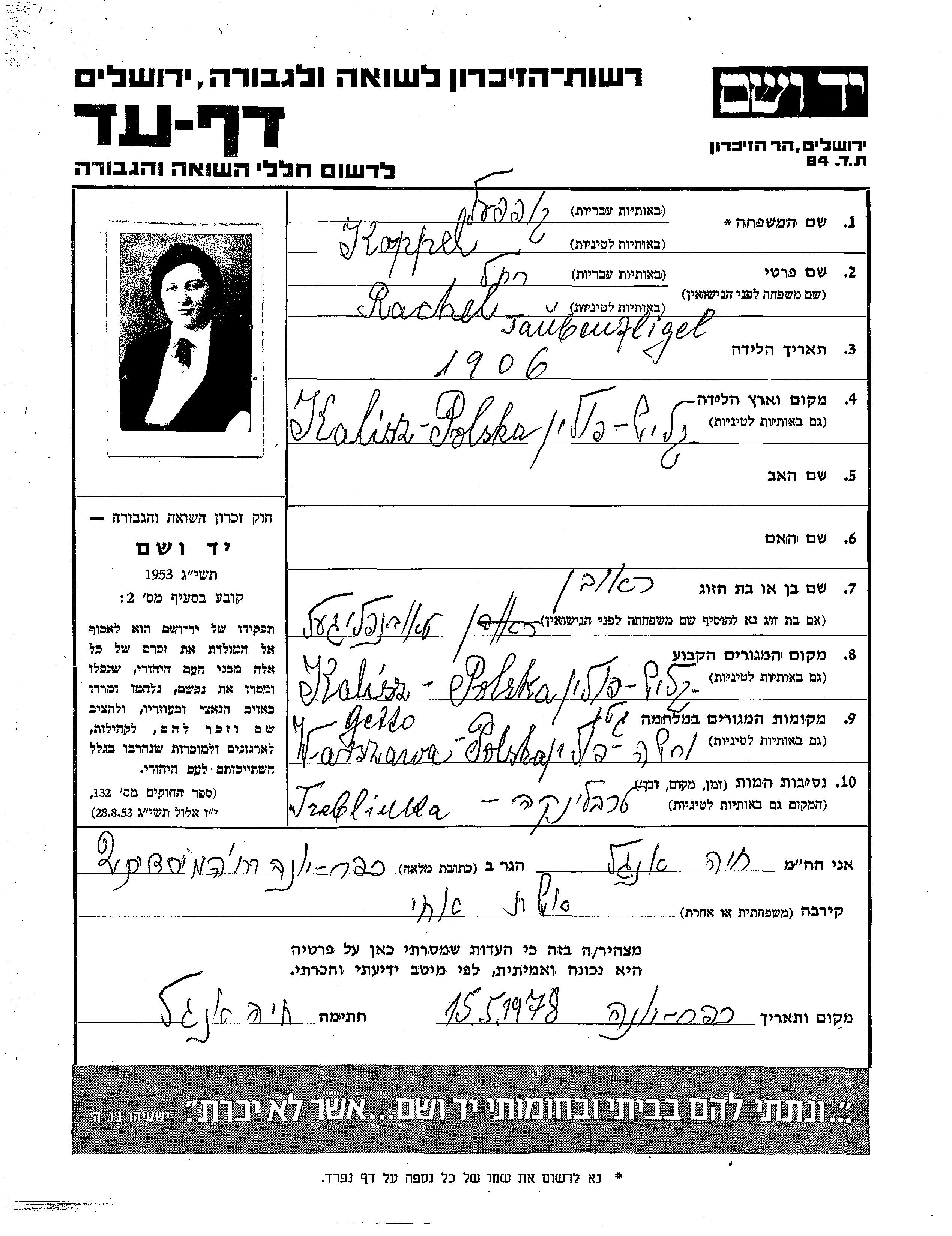 Коппель | Рахель | 1906 | Калиш, Польша | Лист свидетельских показаний |