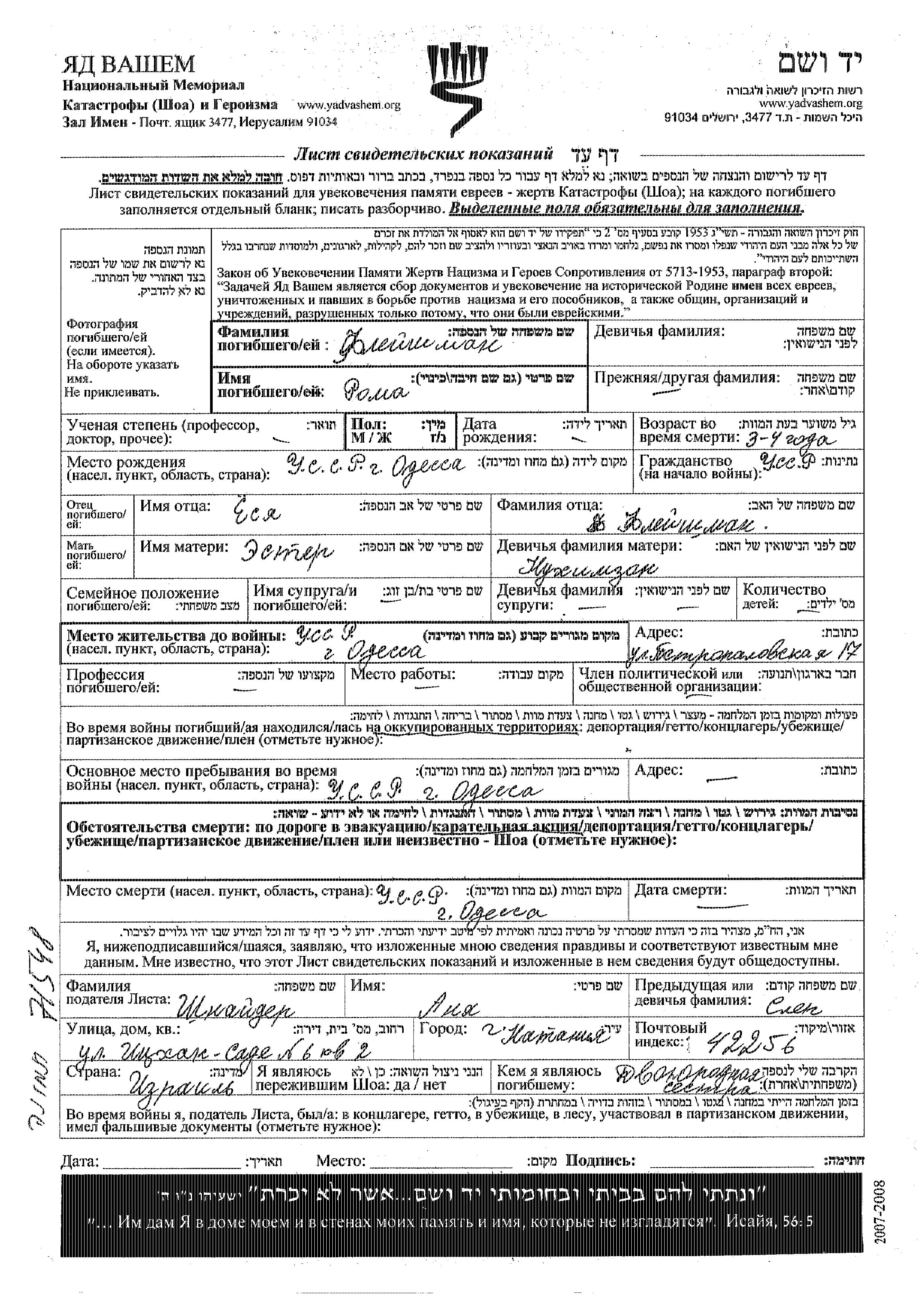 Яд Вашем - Листы свидетельских показаний Мемориального фонда