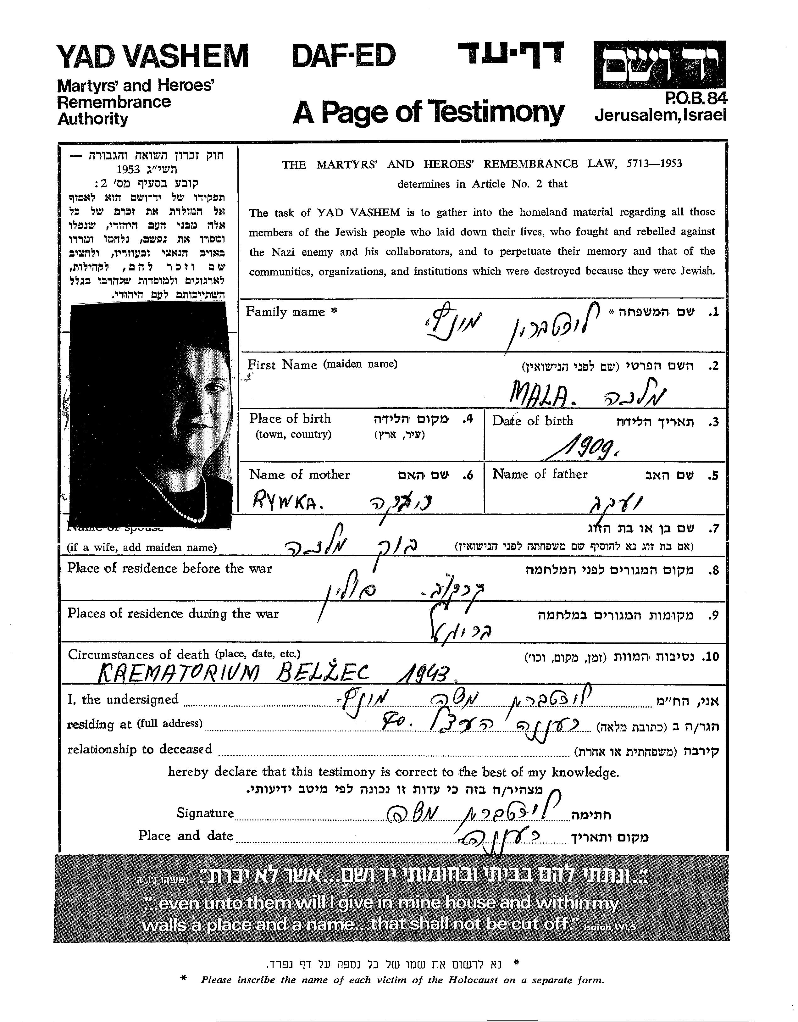 Лихтбраун Мунц | Мала | 1909 | Краков, Польша | Лист свидетельских показаний |