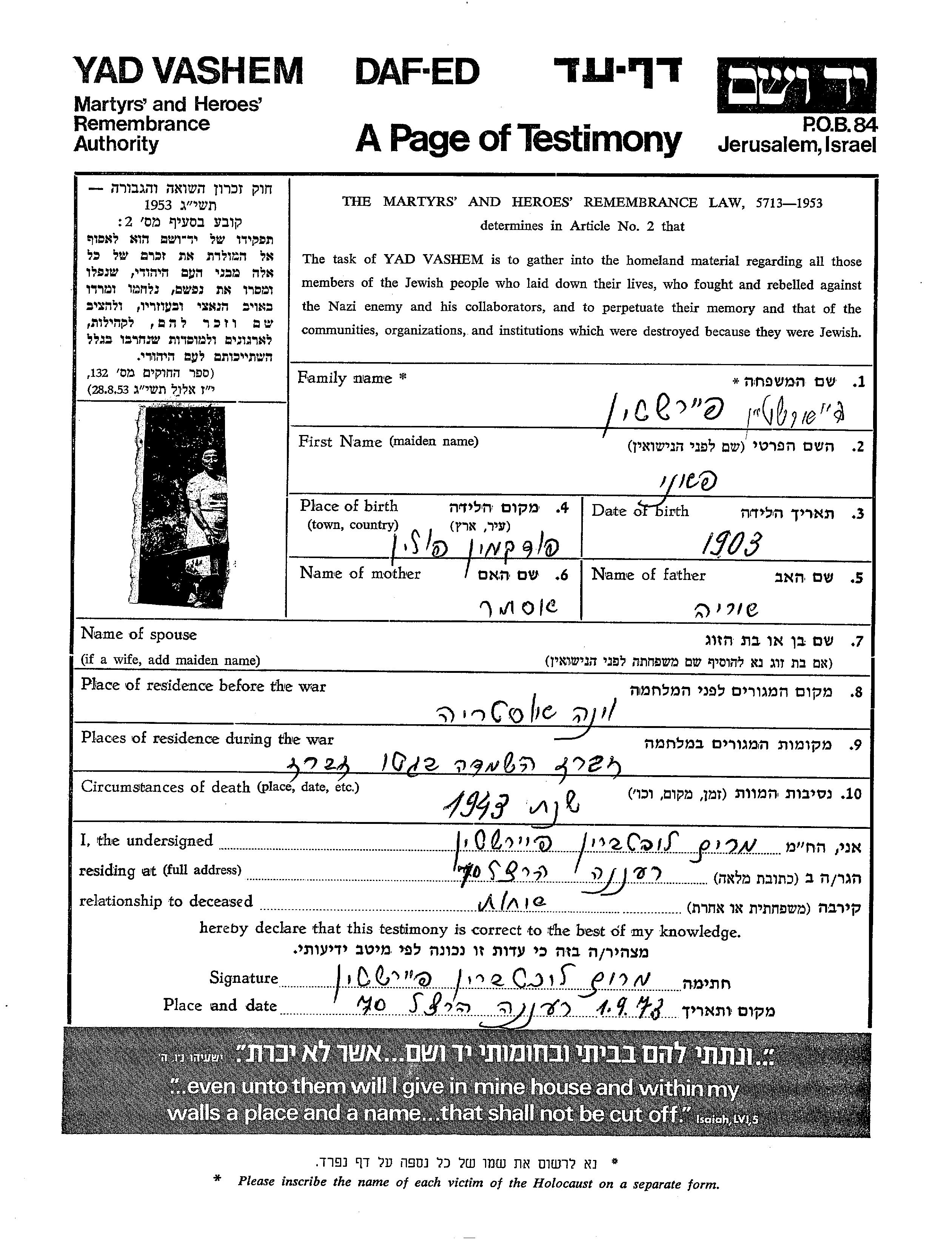 Яд Вашем - Листы свидетельских показаний Мемориального фонда