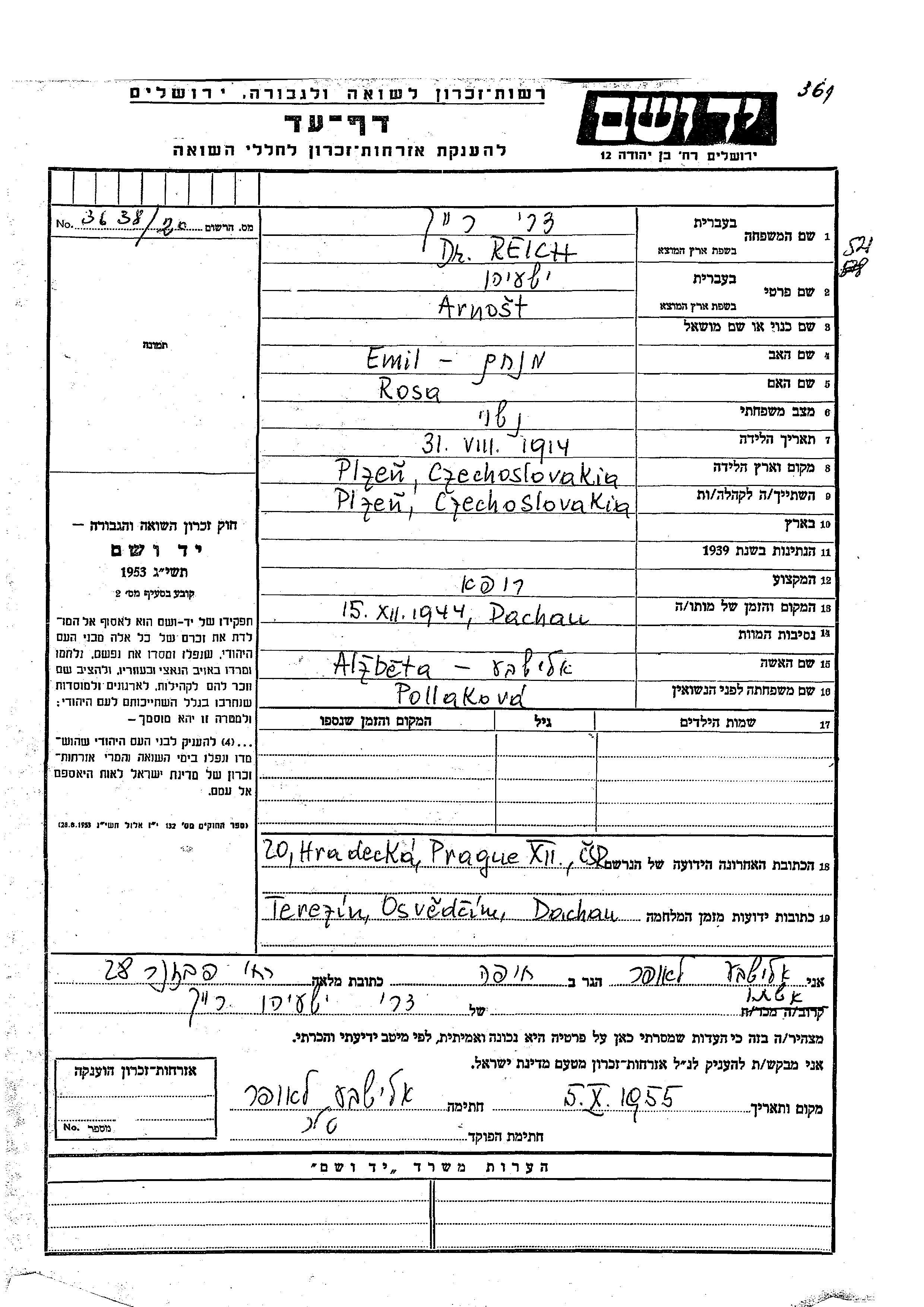 Арношт Иешаягу Рейх, место рождения: Пльзень, Чехословакия. Врач. Место жительства до войны: Пльзень, Чехословакия.