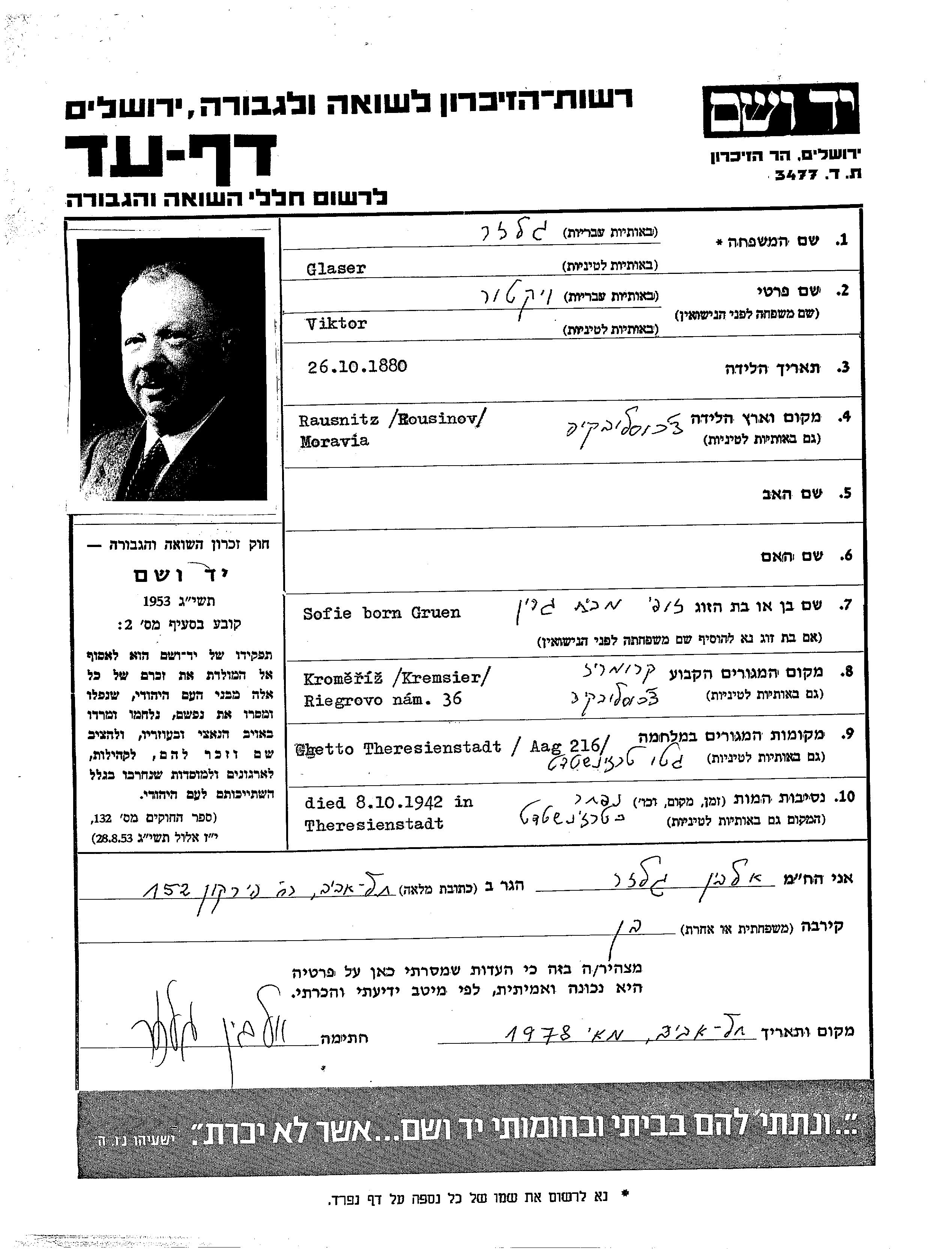 Виктор Гласер, место рождения: Моравия-Силезия, Чехословакия. Место жительства до войны: Кромержиж, Чехословакия.