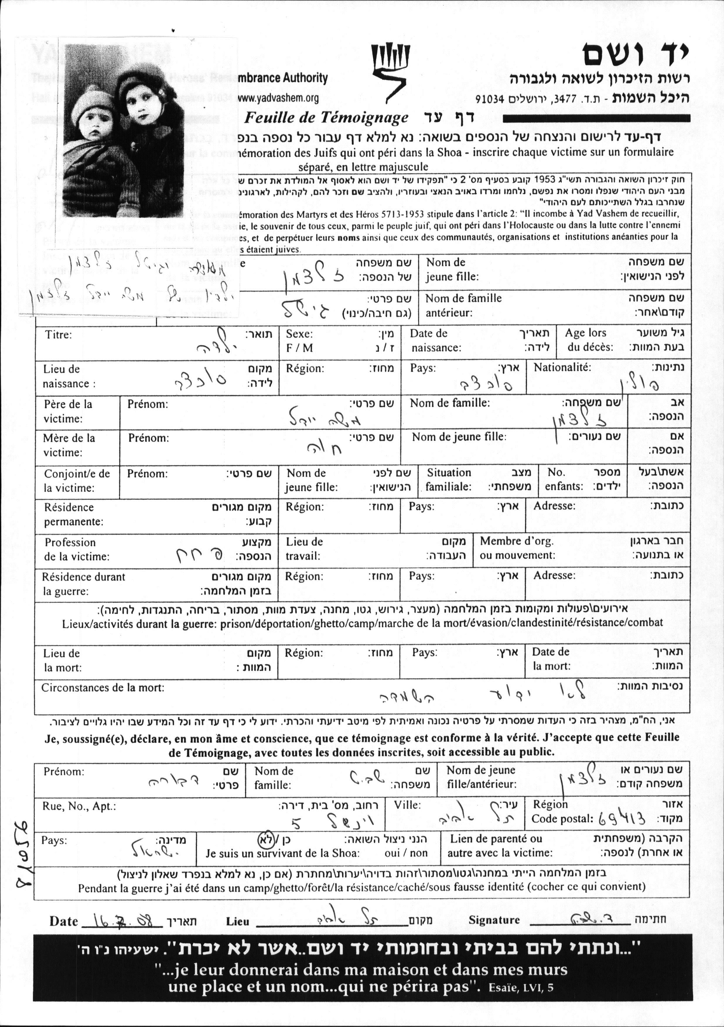 Зальцман | Гитель | Сохачев, Польша | Лист свидетельских показаний | |
