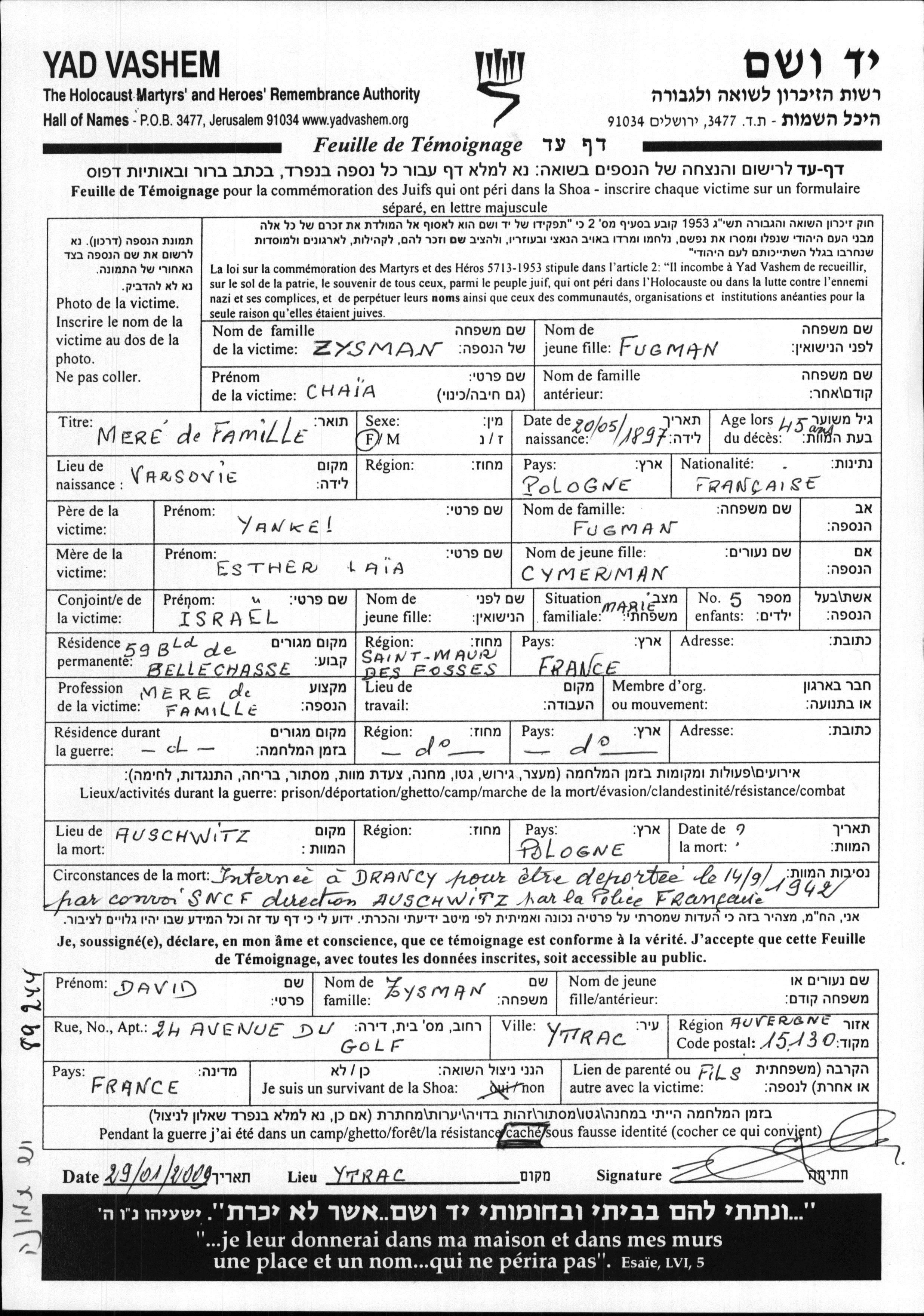 Хая Зысман, девичья фамилия Фугман, место рождения: Варшава, Польша. Домохозяйка. Место жительства до войны: Сен-Мор-де-Фоссе, Франция.
