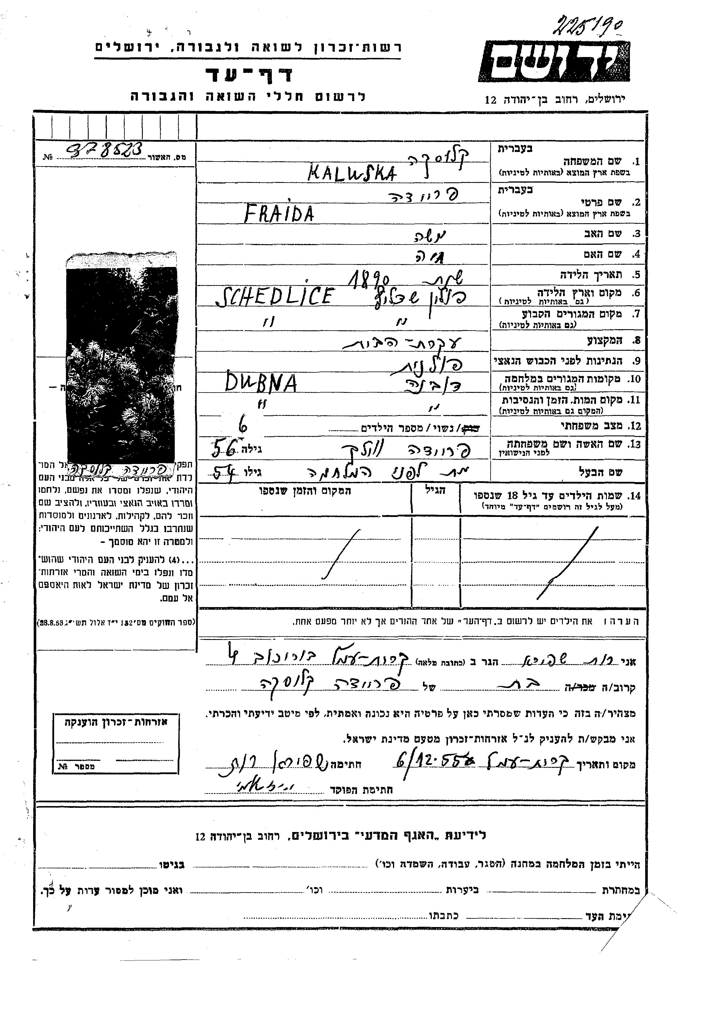 Калуска Фрайда Фрейда 1890 Седльце, Польша Лист свидетельских показаний