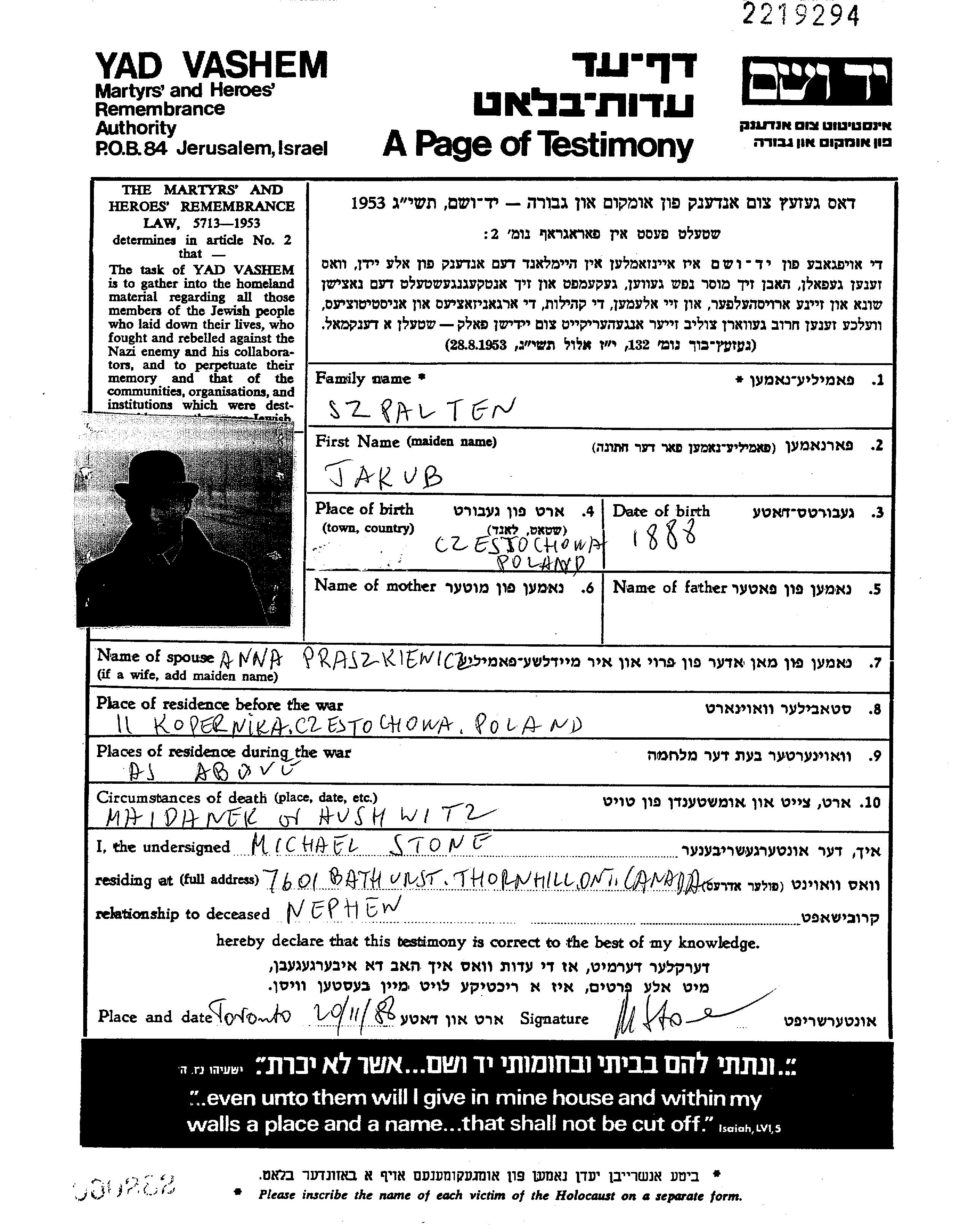 Шпальтен Якуб 1890 Ченстохова, Польша Лист свидетельских показаний