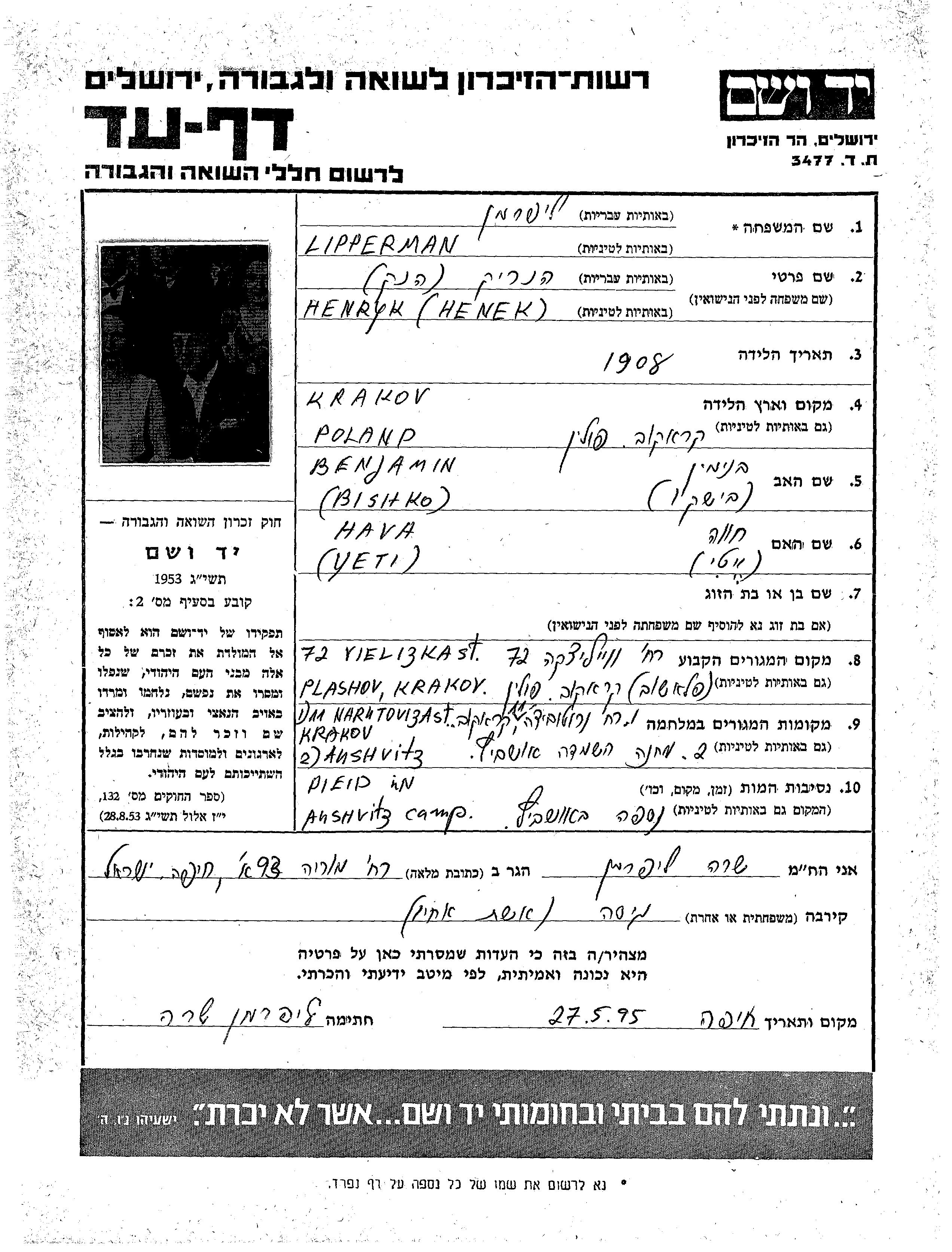 Липперман Хенек 1908 Краков, Польша Лист свидетельских показаний