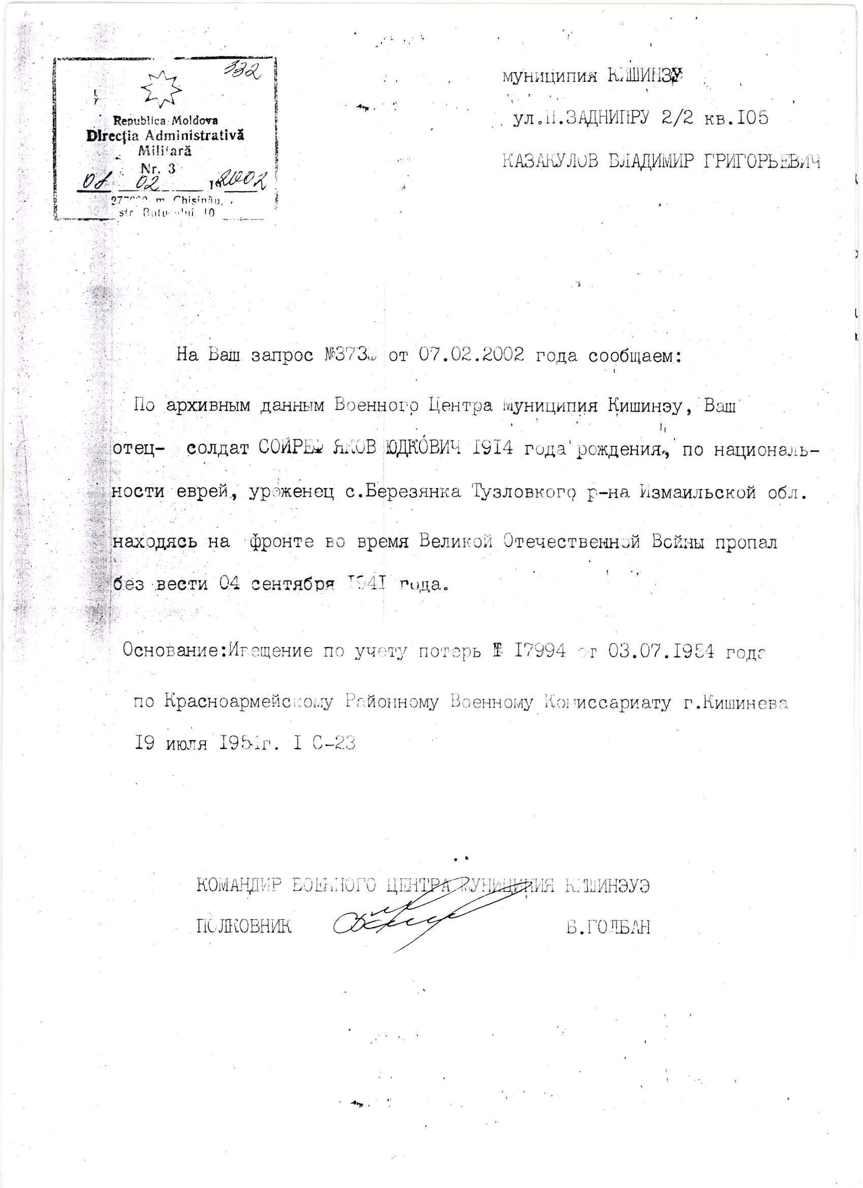 Яков Сойреф, место рождения: Березина, Румыния. Учитель средней школы. Место жительства до войны: Березина, Румыния.