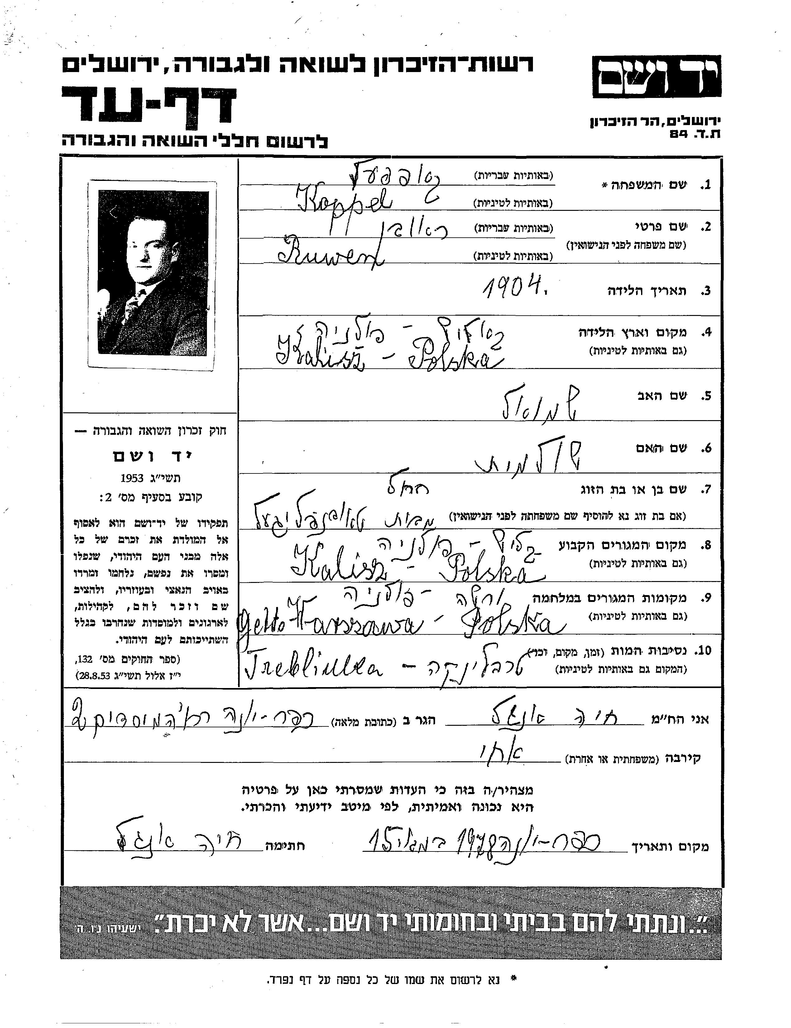 Рувен Коппель, место рождения: Калиш, Польша. Место жительства до войны: Калиш, Польша.