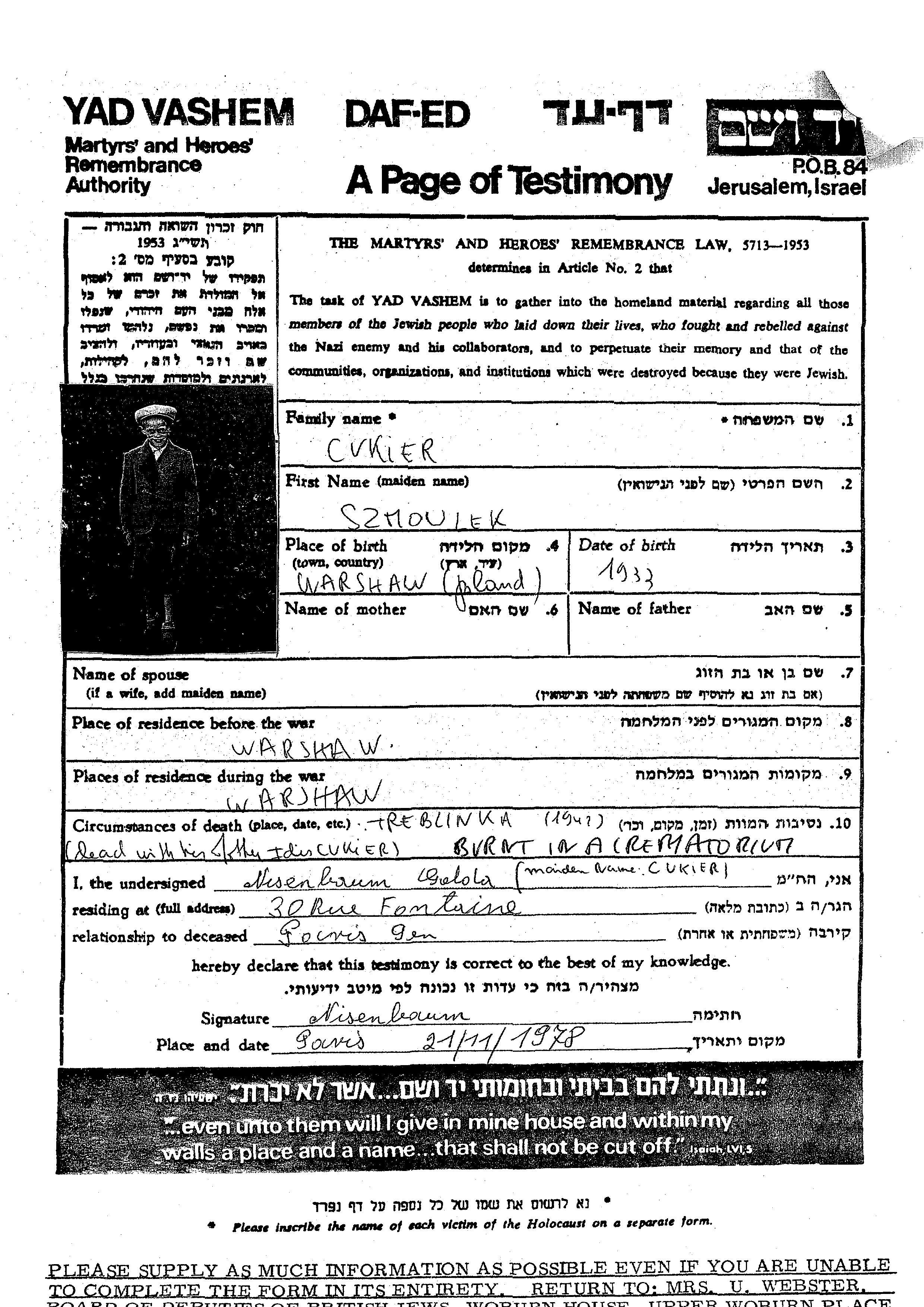 Цукер Шмуэль 1933 Варшава, Польша Лист свидетельских показаний