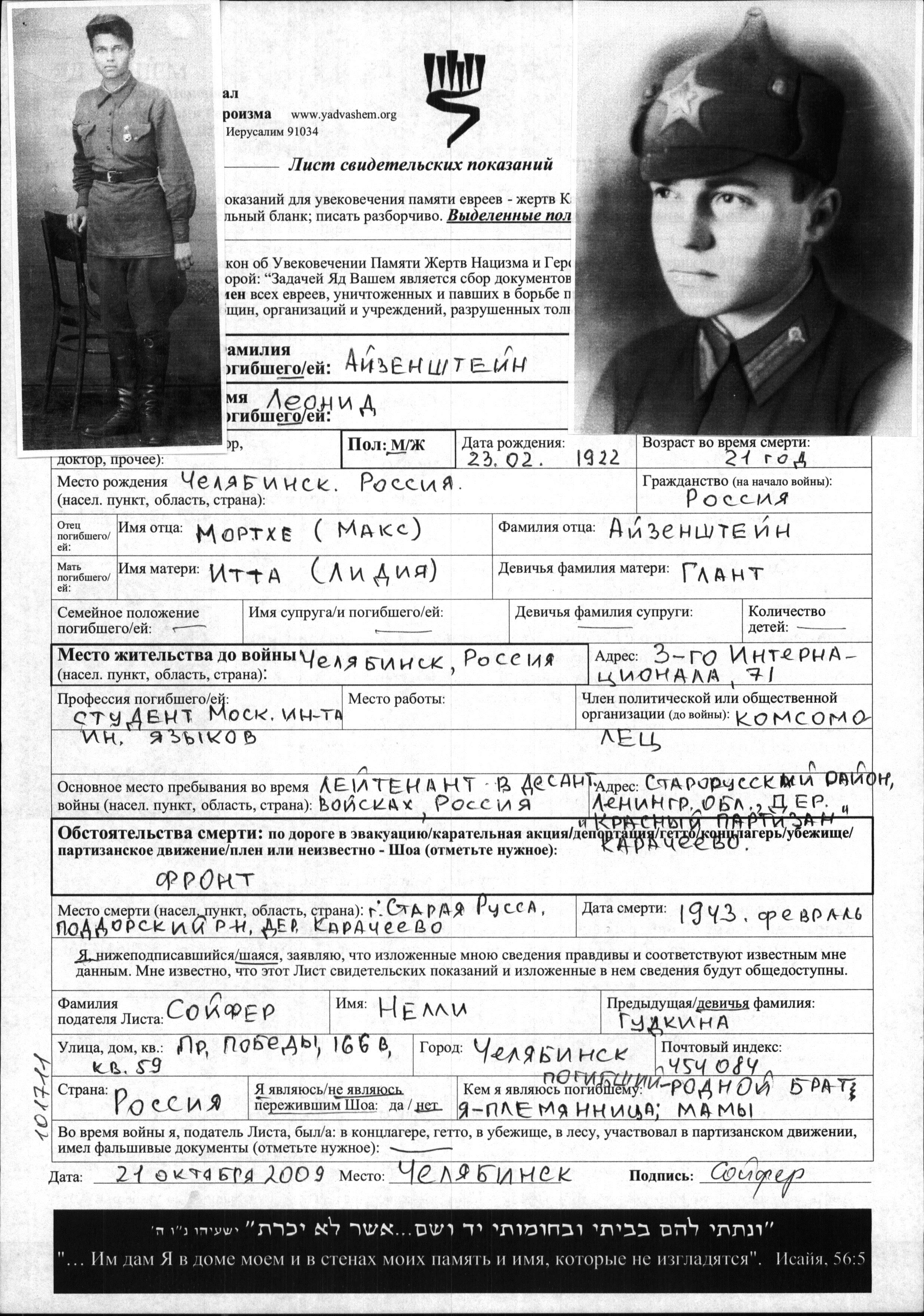Айзенштейн Леонид 1922 Москва, Россия (СССР) Лист свидетельских показаний